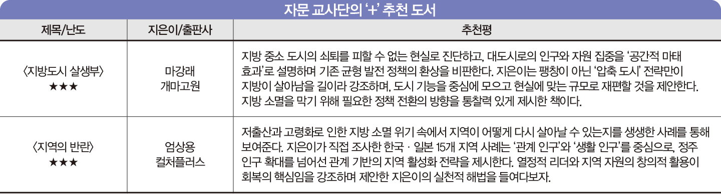 “이 책은 ‘지방 소멸’이라는 개념을 처음 대중적 의제로 끌어올린 선구적 저작입니다. 일본 사회 전반에 충격과 논쟁을 불러일으킨 문제작이기도 하죠. 단순한 인구 감소가 아니라 도쿄로의 인구 집중이라는 구조적 문제를 ‘극점 사회’라는 개념으로 설명하며, 대도시가 인구를 흡수하고도 재생산하지 못하는 ‘인구 블랙홀’임을 지적해요. 특히 지방이 사라지고 도쿄조차 초고령화로 쇠락하는 인구 연쇄 붕괴의 경고는 우리나라의 현실에도 시사하는 바가 큽니다. 이 책은 저출산과 고령화에 대한 통계를 넘어서 국가 전략, 지역 모델, 청년과 여성 정책 등 실천 가능한 해법을 종합적으로 제시합니다. 지방 소멸 문제에 관심 있는 사람에게 강력히 추천합니다.”_ 자문 교사단