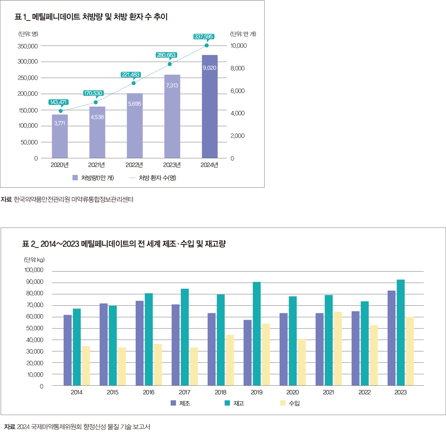 한국의약품안전관리원 마약류통합관리시스템(Narcotics Information Management System, NIMS)으로 보고된 의료용 마약류 취급 내역을 보면, 2024년 의료용 마약류 처방 건수는 약 1억 건, 처방량은 19억2천663만 개로 최근 5년 동안 지속적으로 증가한다. 이 중 메틸페니데이트를 처방받은 환자 수를 분석한 결과, 2020년 14만3천471명에서 2024년 33만7천595명으로 연평균 23.9% 증가했다. 특히 연령대별 처방량을 보면 10대 미만은 2020년 511만 개에서 2024년 1천312만 개(연평균 증가율 26.6%), 10대는 2020년 1천373만 개에서 2024년 3천249만 개(연평균 증가율 24.0%)로, 20대 미만 환자의 처방량이 급증하고 있음을 알 수 있다.