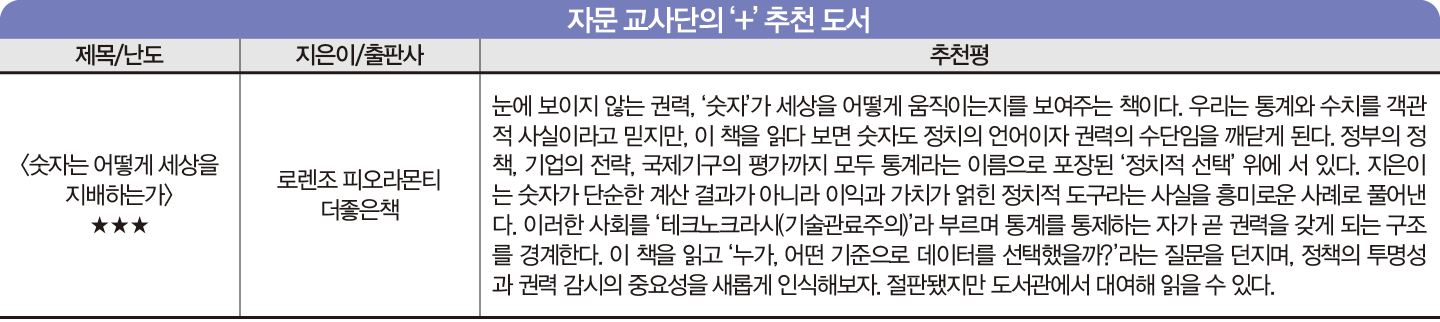 <정치와 법>을 수강하고 있다면 이 책을 읽고 정치가 무엇을 전달하는지, 그것이 정말 옳은 것인지를 고찰할 수 있을 겁니다. 언론과 미디어 분야에 관심이 있는 학생은 언론을 통해 만들어지는 여론의 가치와 그 도덕성에 관해 성찰해도 좋아요. 또는 ‘공정’이라는 단어가 오늘날 여론 속에서 어떻게 활용되는지 탐구해봐도 좋겠습니다.