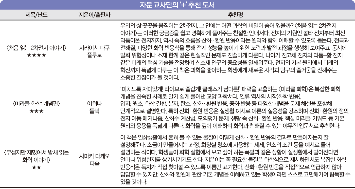 “이 책은 전기 에너지의 기본 개념부터 시작해, 화학 에너지를 전기 에너지로 바꾸는 장치인 최초의 화학 전지, 볼타 전지와 다니엘 전지에 대해 흥미롭게 풀어냅니다. 복잡하게 느껴질 수 있는 산화·환원 반응의 원리도 산소와 전자의 이동이라는 개념을 통해 쉽게 설명돼 있어, 한 번만 읽어도 누구나 명확히 이해할 수 있죠. 우리가 매일 사용하는 스마트폰 리모컨 전기차 속에는 어떤 전지가 들어 있을까요? 이 책은 1차전지와 2차전지의 종류, 작동 원리, 그리고 미래 에너지로 주목받는 연료 전지의 특징과 장단점까지 소개하며, 여러분의 과학 상식을 한층 넓혀줍니다. 화학에 관심은 있지만 어디서부터 시작해야 할지 막막했던 학생에게 최고의 입문서가 될 거예요.”_ 자문 교사단