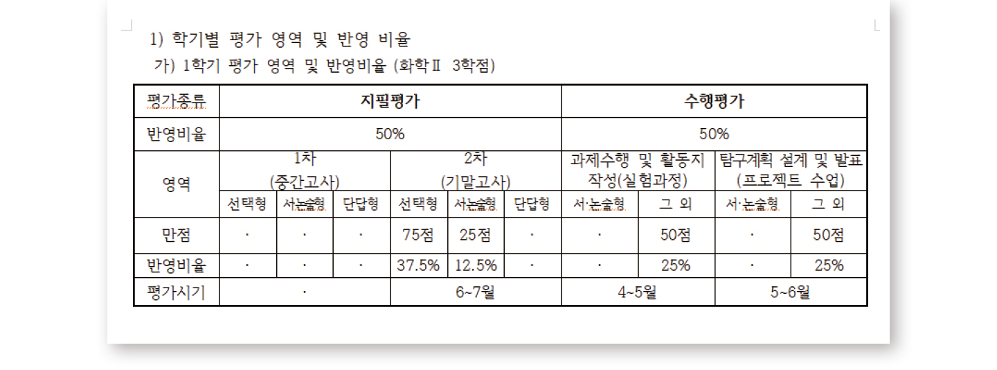 교과의 평가 종류 및 반영 비율을 확인해본다. 대략적인 평가 시기와 문제 유형도 알 수 있다.