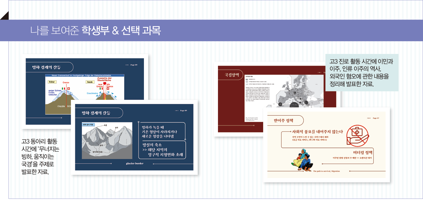 “국경을 설정할 땐 지형적 특성을 이용해요. 스위스와 이탈리아는 알프스산맥을 국경선의 기준으로 삼는데, 빙하가 녹으면서 지형이 바뀌면 국경선을 다시 정해야 하죠. 이는 새로운 국제 분쟁의 씨앗이 될 수 있어요. 기후위기가 초래할 수 있는 문제가 생각보다 다양하다는 걸 알리기로 마음먹었죠. 발표를 진행하며 부원들과 열띠게 토론한 경험은 제가 원하는 지리 수업을 구체화하는 데도 도움이 됐어요. 교사가 된다면 다양한 분야를 희망하는 학생들이 지리를 소재로 각자의 의견을 공유하는 수업을 진행해보고 싶어요.”