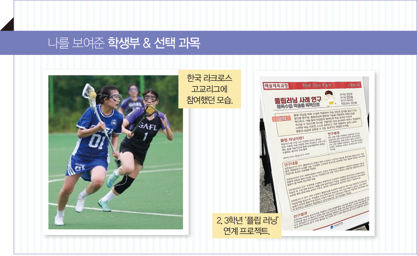 “담임 선생님은 경희대 체육학과를 졸업하셨는데, 자신의 경험을 진솔하게 들려주셨고, 체육 분야에도 정말 다양한 진로가 있다는 걸 구체적으로 알려주셨어요. 무엇보다 ‘가장 가슴이 뛰고 즐겁게 잘할 수 있는 분야를 선택하라’는 진심 어린 조언이 크게 와닿았어요. 결국 3년간 사회과학 분야로 짜둔 시간표를 전면 수정했고 2학년부터 예술·체육 학급을 선택했어요.”