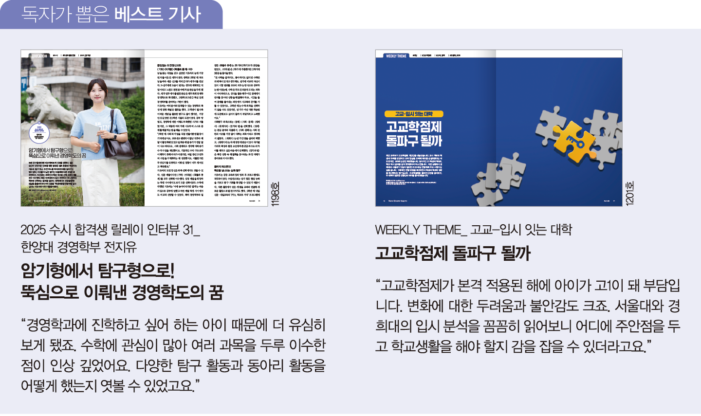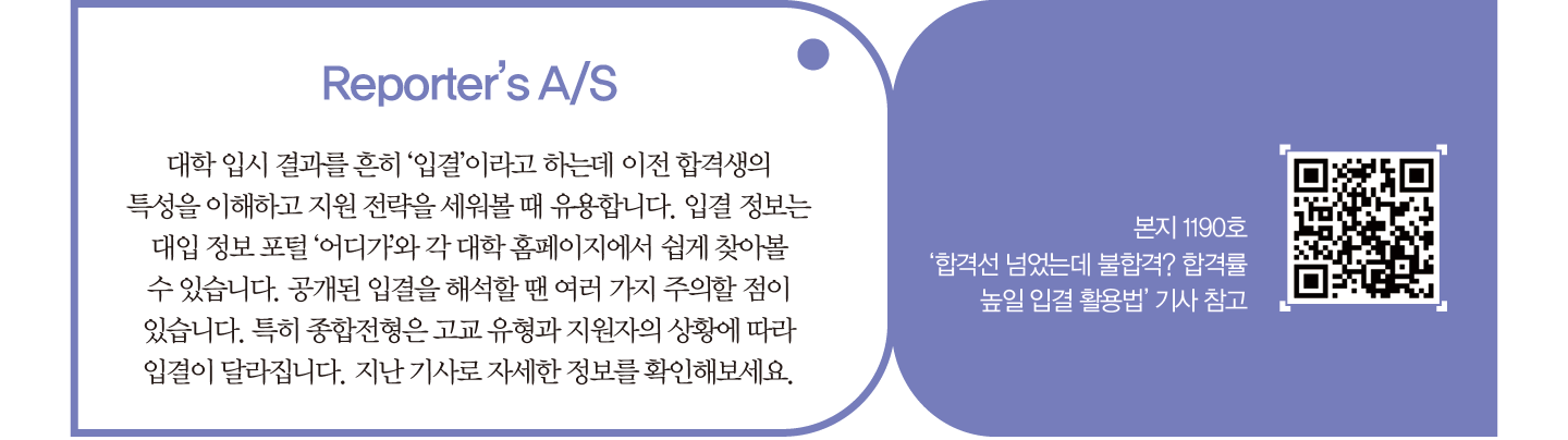 ‘수시 합격생 릴레이 인터뷰’를 흥미 있게 챙겨 보고 있어요. 합격생의 다양한 학교 활동이나 호기심을 해결하는 탐구 역량, 지속적인 독서 이력이 놀랍더라고요. 앞으로 다양한 전공의 합격생 인터뷰를 기대합니다. 또한 대학이 2028년 입시안을 발표하면 발 빠르게 정확한 분석 기사를 써주시길 기대할게요.