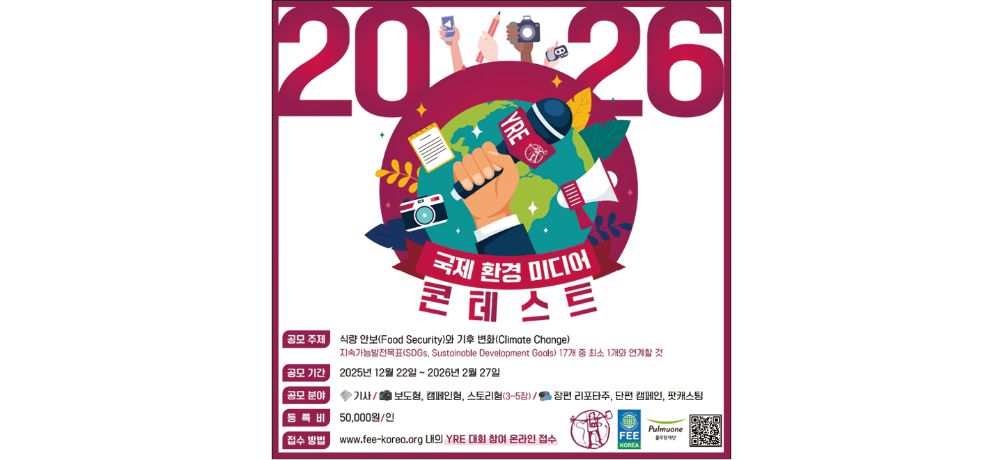 식량 안보와 기후변화를 주제로 국제 청소년 공모전이 열린다. 보도형·환경 캠페인형·스토리형 사진, 기사, 영상, 팟캐스트 등 다양한 분야에 공모할 수 있다. 대회 홈페이지(fee-korea.org)에접속,‘YRE대회참여’메뉴에서 온라인으로 접수하면 된다. 부문별 최우수상 수상작은 국제대회에 한국 대표로 출품된다. 이 경우 번역 혹은 자막을 별도 제출해야 한다. 미디어 콘테스트인 만큼, 출품작을 많은 사람이 볼 수 있도록 개인 SNS에 게시하면 가산점을 받을 수 있다.
