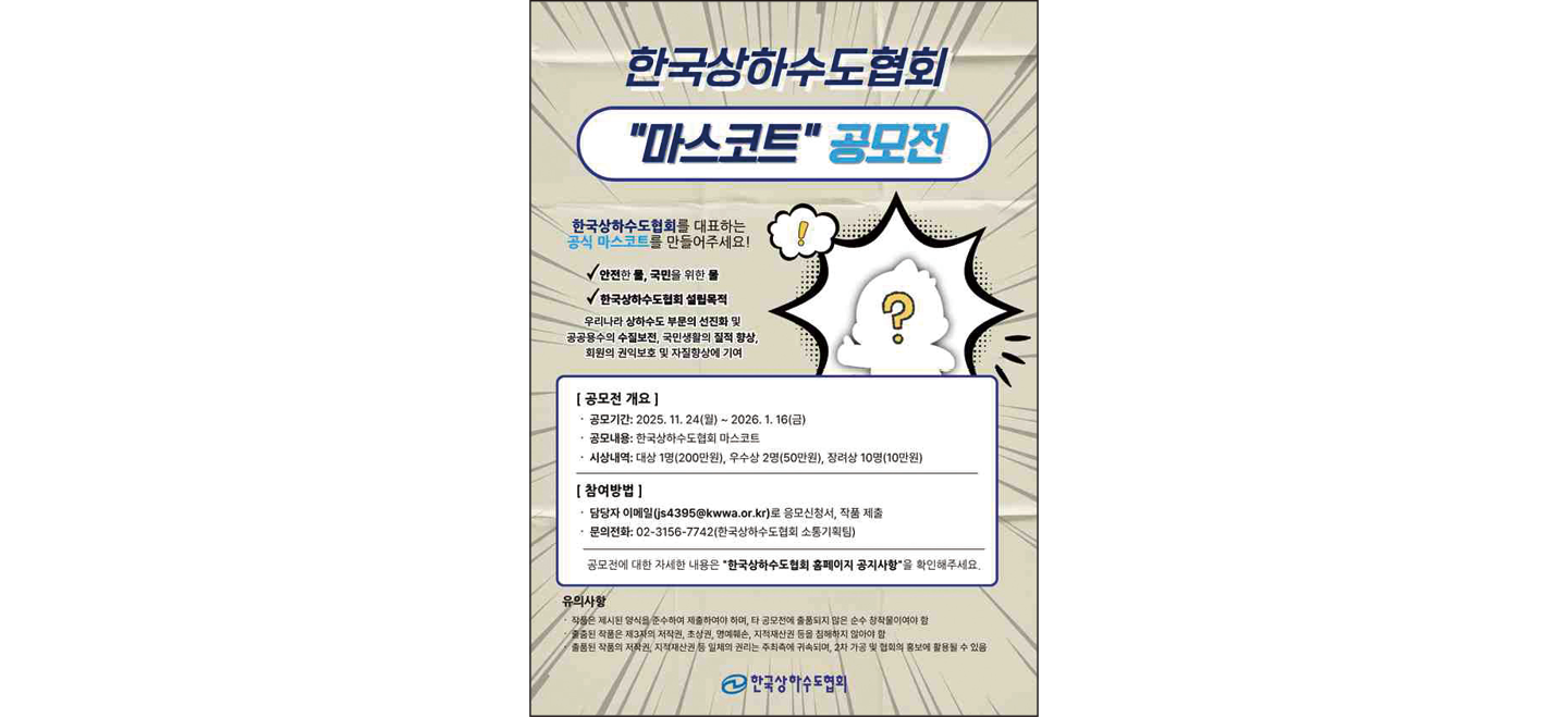 한국상하수도협회에서 협회를 대표할 마스코트 콘텐츠를 공모받는다. 국민에게 친근한 캐릭터를 통해 안전한 물을 강조하고 국내 상하수도 선진화를 알릴 수 있어야 한다. 30dpi 이상 ai PDF JPG JPEG PNG 등의 이미지파일을이메일(js4395@kwwa.or.kr)로제출하면된다. 대상 수상자에게는 상금 200만 원을 수여한다.
