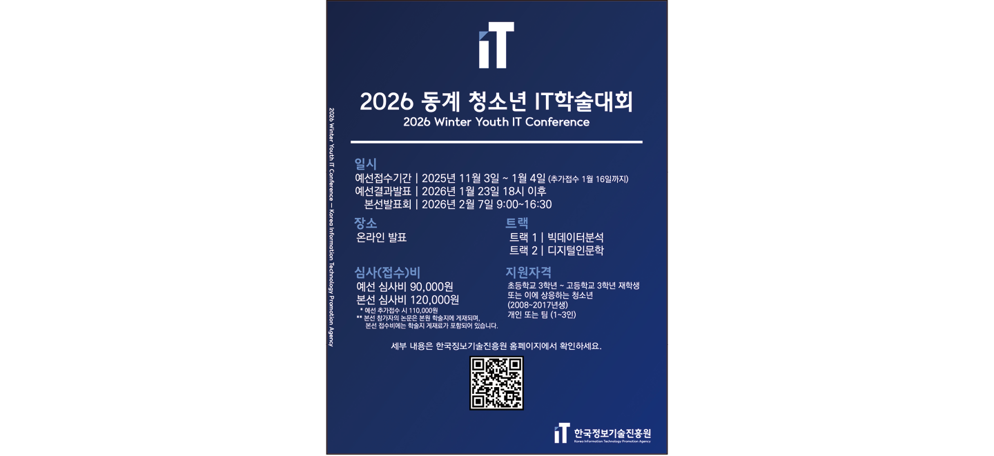 청소년이 IT 기술과 융합에 대해 탐구하고, 미래의 융합IT 리더로 성장할 수 있는 학술대회가 열린다. 빅데이터 분석, 디지털 인문학 두 분야로 나누어 개최되며 중복 지원이 가능하다. 한국정보기술진흥원 홈페이지에서 참가비를 내고, 접수 양식에 맞춰 작성한 서류와 논문을 이메일(contest@kitpa.org)로제출하면된다.