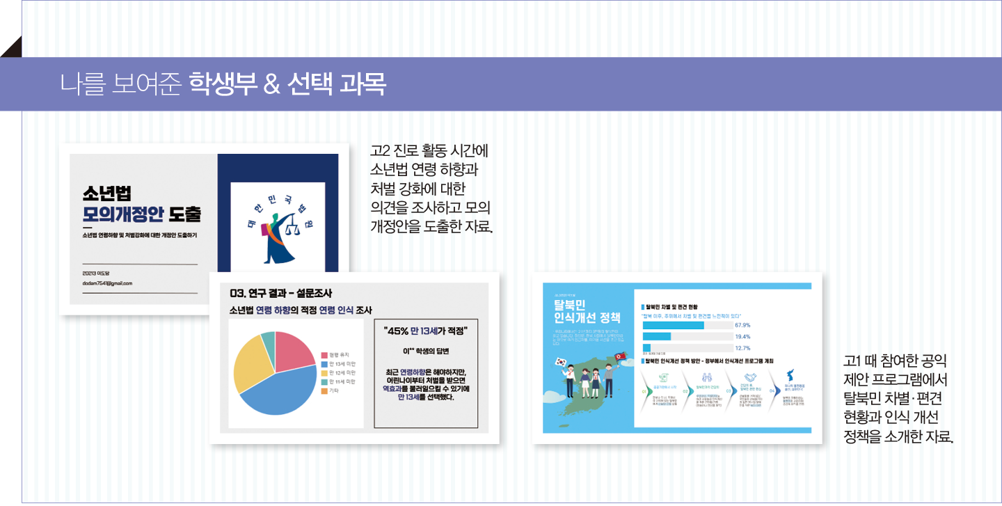 <통합사회> 현대 사회에서 새롭게 요구되는 권리인 잊힐 권리가 알 권리를 침해한다는 기사를 접하고 자신의 의견을 글로 작성함. 인터넷 영상 플랫폼 기업의 가격, 화질, 콘텐츠 종류 등을 조사한 후, 각 항목에 가중치를 적용해 가치를 계량화하여 합리적인 소비 의사 결정을 이끔 <영어> 탈북민 인식 개선 정책을 계획하고 인식 개선 프로그램, 경제적 지원 제도 마련 등 구체적인 공익 활동을 제안서와 영어 포스터로 나타냄