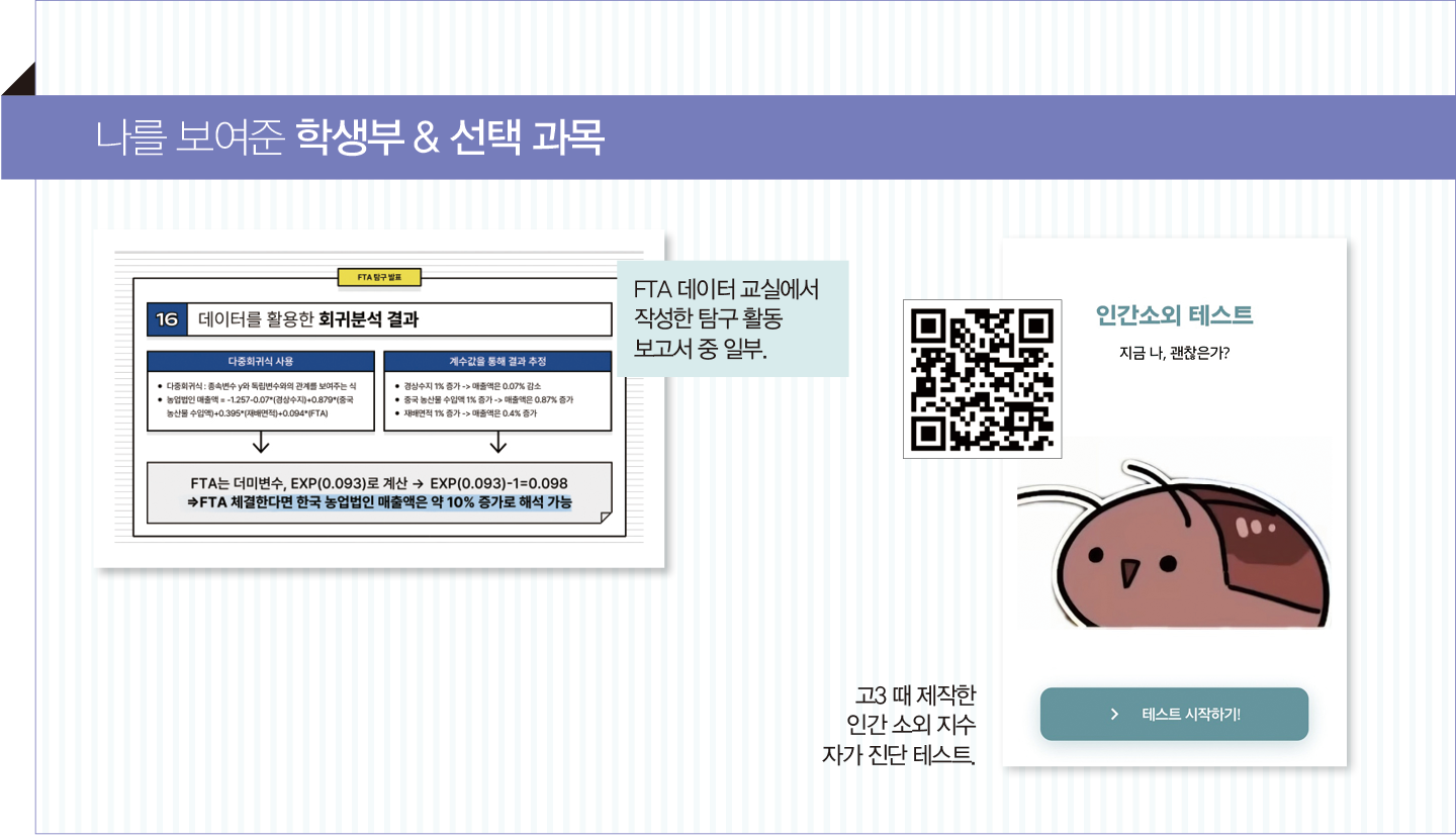 “수상도 기뻤지만, 제 고교 활동의 분기점이 돼 인상이 남아요. <경제> 개념을 구체적 사례로 이해했고 협업 경험도 쌓은 데다, 데이터 기반 탐구를 시작할 수 있었기 때문이죠. 사실 자연 성향 학생은 실험을 하며 자신의 생각을 현실에서 구현·검증하는데, 인문 성향은 그럴 기회가 없어요. 수업 덕분에 회귀분석법과 엑셀을 활용해 객관적이고 분석적인 결과물을 만들게 됐어요. 고3 <확률과 통계> 시간에 엑셀로 SNS 사용 시간과 업무 생산성 간의 상관계수를 산출하거나, 학술제에서 2천200명의 고객 정보를 분석해 맞춤형 마케팅 전략을 수립하거나, 동아리에서 ATM 기기 수·지역 은행망·기준 금리를 변수로 삼아 금융접근성이 1인당 GDP에 미치는 영향을 분석하는 데 큰 도움이 됐고요.”