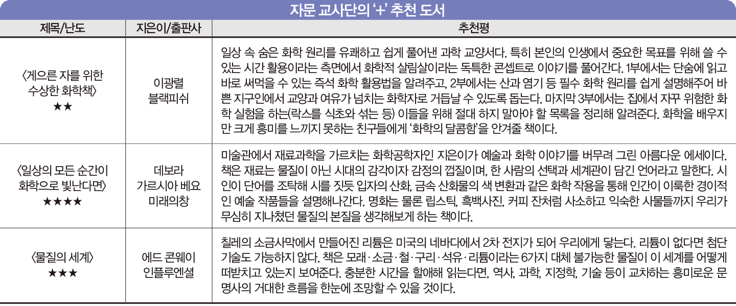 “이 책은 오랜 기간 학문에 매진해 온 노(老)화학자가 자신의 삶에서 얻은 지혜를 화학 이론에 빗대어 들려주는 에세이입니다. 딱딱하게만 보이던 화학 법칙은 그의 손에서 삶의 의미와 태도를 비추는 거울이 되고, 오랜 연구를 통해 얻은 성찰은 학문을 넘어 깊은 울림을 주죠. 촉매를 통해 치유를 이야기하거나, 르샤틀리에 원리를 설명하면서 평형에 이르는 길에 대해 들려주는 등 화학을 통해 바라본 인생의 깨달음이 가득 담겨 있어요. 고등학교 수준을 넘어 화학을 깊이 있게 사유하고자 하는 이, 화학이라는 렌즈로 세상을 새롭게 바라보고 싶은 학생, 그리고 학문과 삶을 연결하는 사고를 경험하고 싶은 청소년에게 특히 추천합니다.”_ 자문 교사단