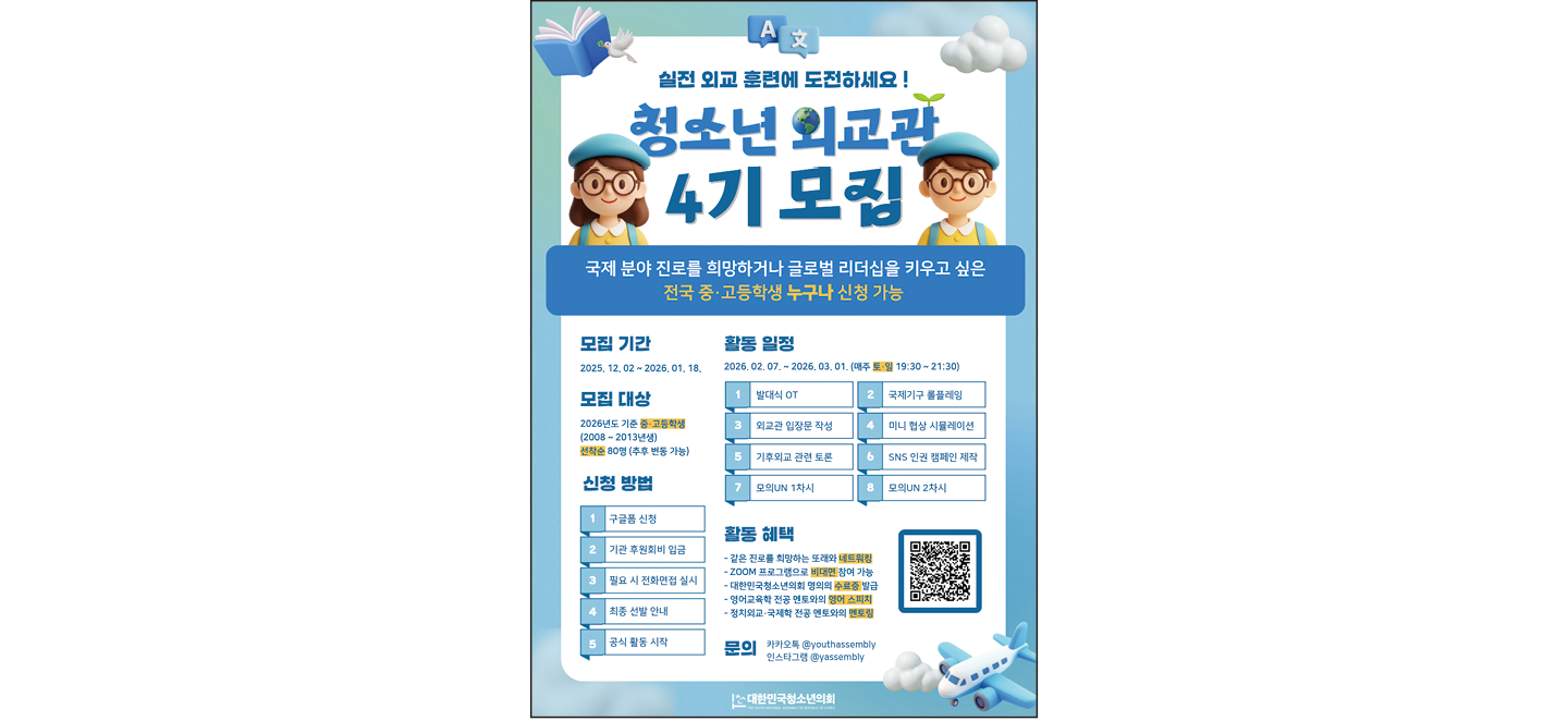 대한민국청소년의회 청소년 외교관 프로그램의 4기 외교관으로 활동할 청소년을 모집한다. 프로그램에 참여하면 정치외교·국제학 전공 멘토를 만나 외교관에 대해 알아보고 국제기구, 국제법, 인권 등 폭넓은 외교 관련 이론을 공부한다. 모의 UN 프로그램을 통해 공식 문서 작성과 토론, 협의 등의 과정을 직접 체험하며 외교관 업무를 자세히 배울 수 있다. 다양한 시사 주제로 영어 스피치도 진행한다. 구글폼으로 신청하면 되고, 5회 이상 참석하면 수료증을 발급받는다.