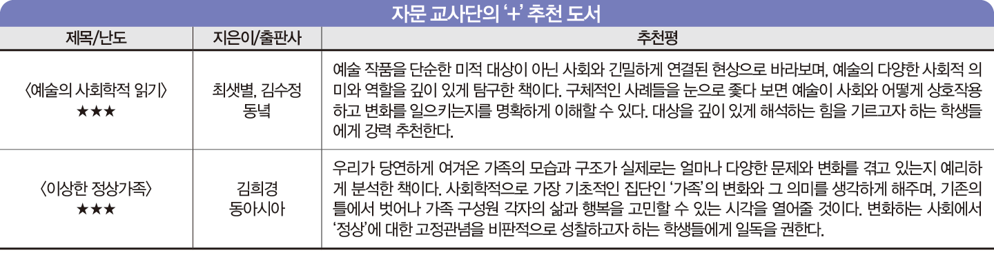 ✔︎ 일상에서 ‘왜?’라고 묻는 힘이 필요한 이유에 대해 친구들과 의견 나누기 ✔︎ 높은 자살률, 전세 사기, 불안정한 일자리와 주거 등 현대 도시의 주요 문제에 대해 개인이 취해야 할 대처 방법과 사회 전체가 져야 할 구조적 책임의 균형점 논의하기 ✔︎ 소셜 미디어의 발달이 유일한 ‘무대 뒤 공간’인 ‘집’에 어떤 영향을 미치고 있는지 정리하기 |