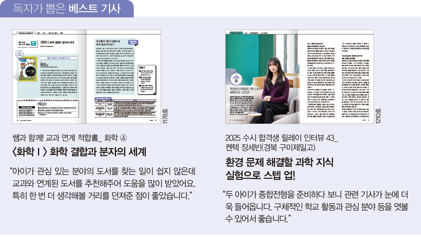 아이들이 고2와 고3이 되는데, 수행평가를 준비할 때 참고합니다. 아이들이 관심 있는 과목이나 진로가 소개되면 읽어보고 공유하고요. ‘교과 연계 적합書’는 수행평가 준비에 필요한 자료를 찾는 데 활용합니다. 합격생이 전공과 관련해 어떤 독서 활동을 했는지 소개해줘서 도움이 많이 됩니다. 참, 온라인으로도 기사를 볼 수 있어서 활용하기 편해요.