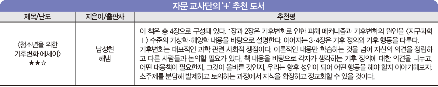 저는 <지구과학Ⅰ> 시간에 이 책을 읽고, 기상청에서 매년 발간하는 이상기후 보고서를 확인해 2022년 발생한 이상기후의 배경에 지구 온난화가 있음을 소개했습니다. 이 과정에서 지은이의 경고가 우리 주변에서 어떻게 나타나고 있는지 확인할 수 있었죠. 저처럼 기상과 기후, 환경에 관심이 있는 학생은 물론 에너지 관련 학과를 희망하는 학생에게도 추천해요.