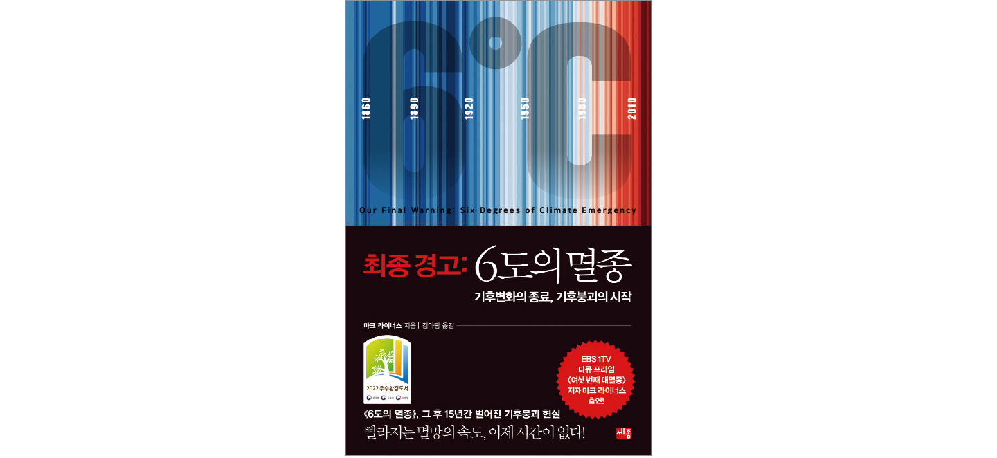 2014년 마크 라이너스는 <6도의 멸종>을 통해 지구 기온이 1℃씩 오를 때마다 어떤 일이 벌어질지 경고했어요. 그리고 10여 년이 지난 지금, 지은이가 우려했던 미래는 이제 현실이 됐죠. 이 책은 ‘최종 경고’라는 문구를 덧붙인 신간으로 앞으로 지구의 온도는 더 빠르게 변화할 것이라 경고합니다. 동시에 탄소 배출 감축처럼 우리가 지금 실천할 수 있는 일을 고민하게 만들어요.