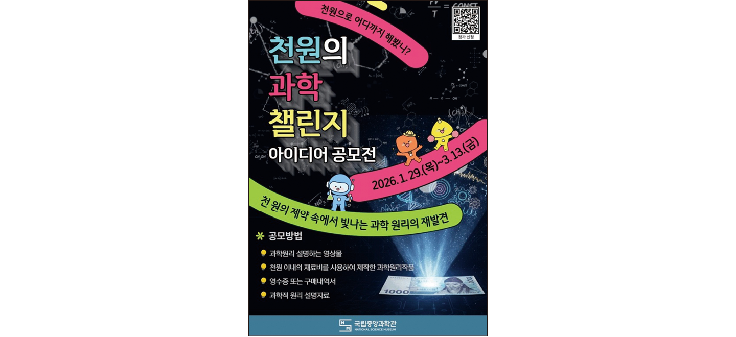 국립중앙과학관에서 누구나 참여할 수 있는 ‘천원의 과학 챌린지 아이디어 공모전’을 개최한다. 재료비 1천 원 내외의 간단한 재료를 활용해 초·중·고 교과서 속 기초과학 원리를 설명하는 작품을 만드는 것이 주제다. 1천~1천999원의 재료비를 사용해 제작한 과학 키트 또는 모형과 제작 과정·원리를 설명하는 1분 내외의 동영상을 제출해야 한다. 영수증과 교과 연계 내용을 담은 300자 이내의 설명 자료도 함께 첨부해 네이버폼으로 접수하면 된다. 대상 수상자에게는 갤럭시 워치8을 수여한다. 응모 분야가 청소년부와 일반부로 나뉘어 있어서 학생들도 부담 없이 참여할 수 있다.