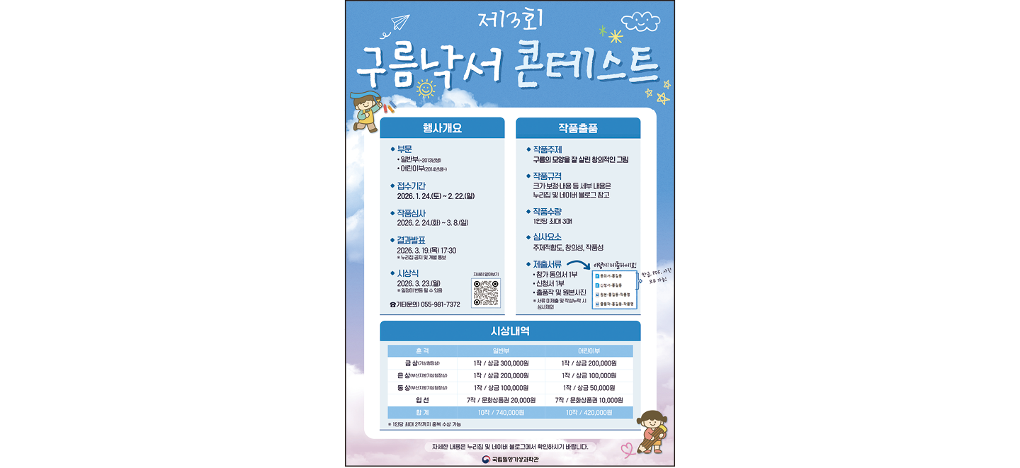 국립밀양기상과학관에서 구름 모양을 살린 창의적인 그림을 공모한다. 직접 촬영한 사진을 이용한 디지털 드로잉 작품과 작품 설명을 담은 신청서를 이메일(mysci@korea.kr)로 접수하면 된다. 원본 사진의 구름 형태를 변형·수정하거나 AI로 이미지를 생성한 경우는 실격 처리되니 주의하자. 일반부 금상 수상자에게는 30만 원, 어린이부 금상 수상자에게는 20만 원을 수여한다.