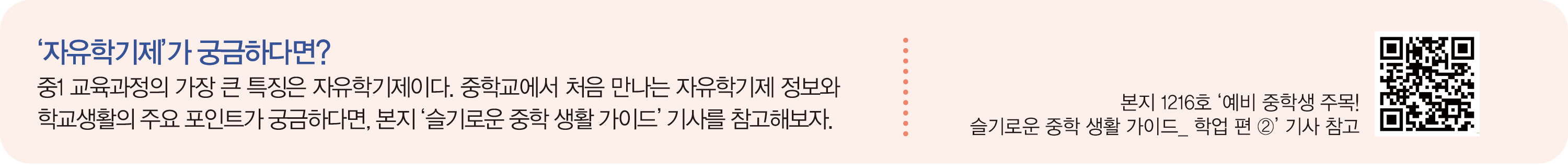 입학 후 숨 돌릴 틈 없이 자유학기제 주제 선택 수강 신청이 시작된다. 학교마다 책 만들기, 카드뉴스 제작, 디지털 드로잉, 단편 영상 제작, 스마트폰 앱 개발 등 학생들의 관심사를 반영한 다양한 프로그램이 개설된다. 자유학기제 활동은 고입에 반영되지 않고 교과 성취도도 따로 나오지 않아 부담 없이 관심 분야를 ‘찍먹’해볼 수 있는 절호의 기회다. 인기 프로그램은 접수 시작과 동시에 마감되는 경우가 많으니, 꼭 듣고 싶은 프로그램 2~3개를 미리 정해두는 것이 좋다.