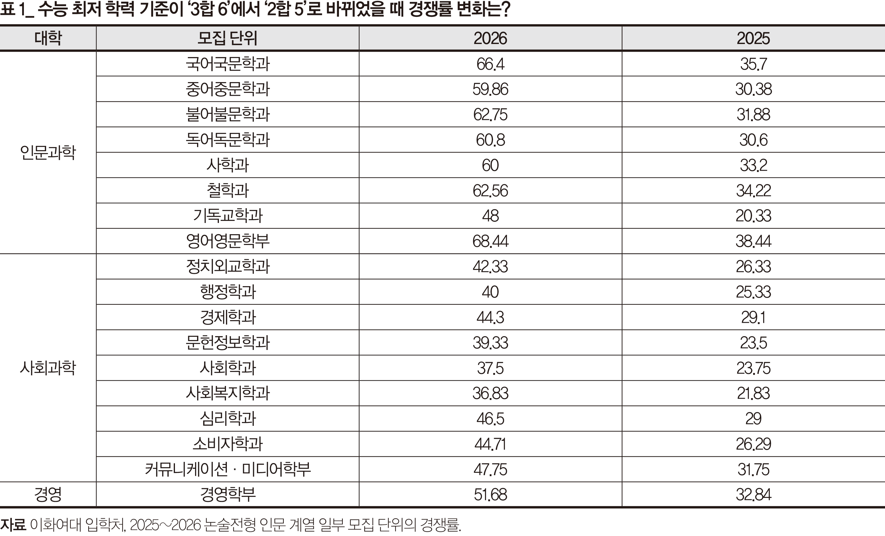 최근 최저 기준의 반영 영역 수를 줄인 이화여대를 예로 들어볼까요? 이화여대는 논술전형에서 인문 계열의 최저 기준을 2025학년 3개 영역 등급 합 6 이내에서 2026학년 국어 포함 2합 5로 변경했죠. 그 결과 논술전형 인문 계열 모집 단위의 경쟁률이 2배 가까이 상승했습니다(표 1). ‘3합’보다 ‘2합’을 충족하기가 수월한 만큼, 충족률도 높아지고요.