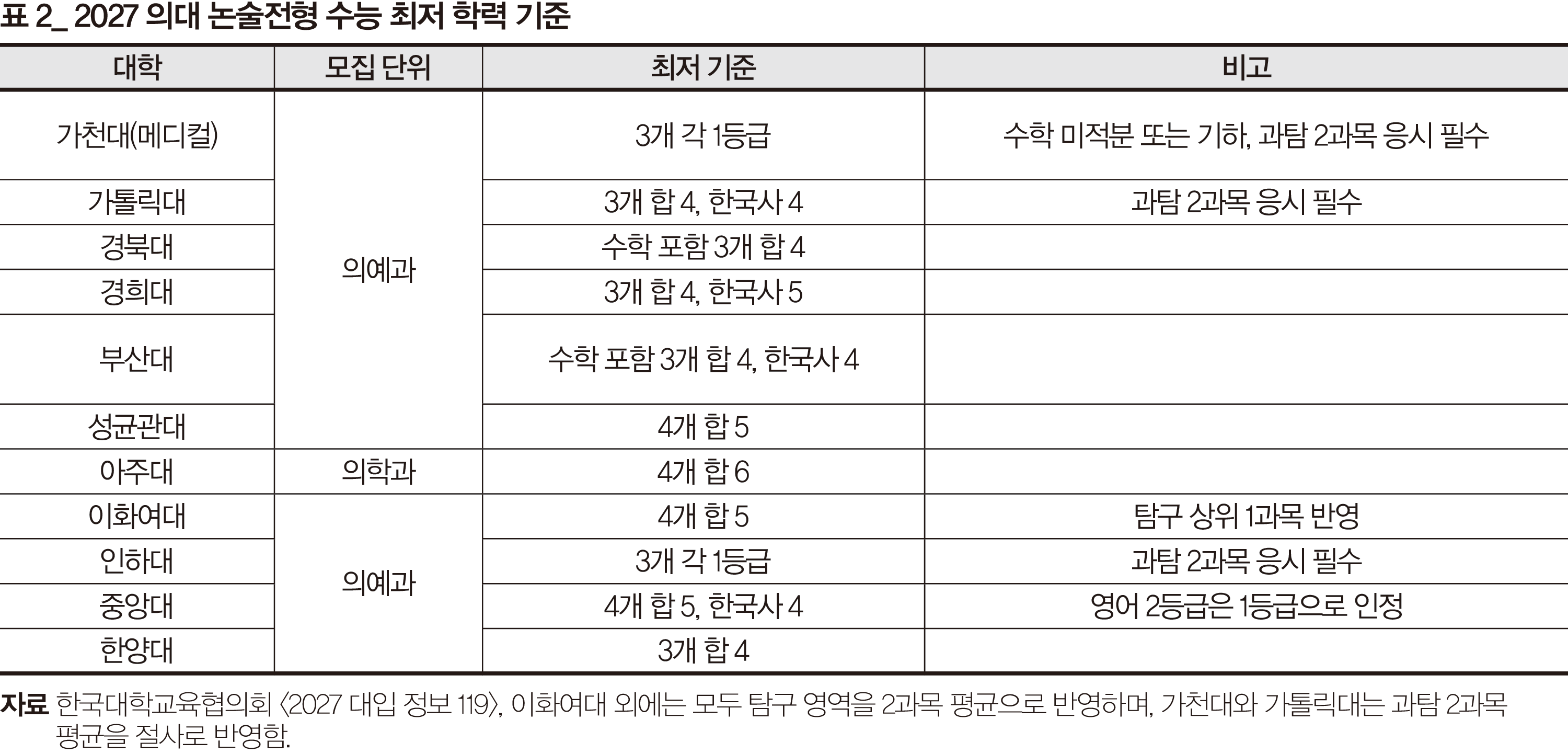 서울 주요 대학, 전국 의약학 계열, 지역 거점 국립대는 수시전형 중 학생부교과전형과 논술전형에 최저 기준을 적용하는 경우가 많습니다. 합격선이 높을수록 최저 기준이 높은 편이고요. 특히 최상위권의 선호도가 높은 의대는 ‘3합 4’ 또는 ‘4합 5’를 요구하는 대학이 많습니다(표 2). 그만큼 수능 준비에 만전을 기해야 하며, 탐구 반영 과목 수는 물론 평균이나 절사 등의 반영 방식도 꼼꼼하게 살펴본 후 자신에게 가장 유리한 방안을 찾아 지원해야 합니다.