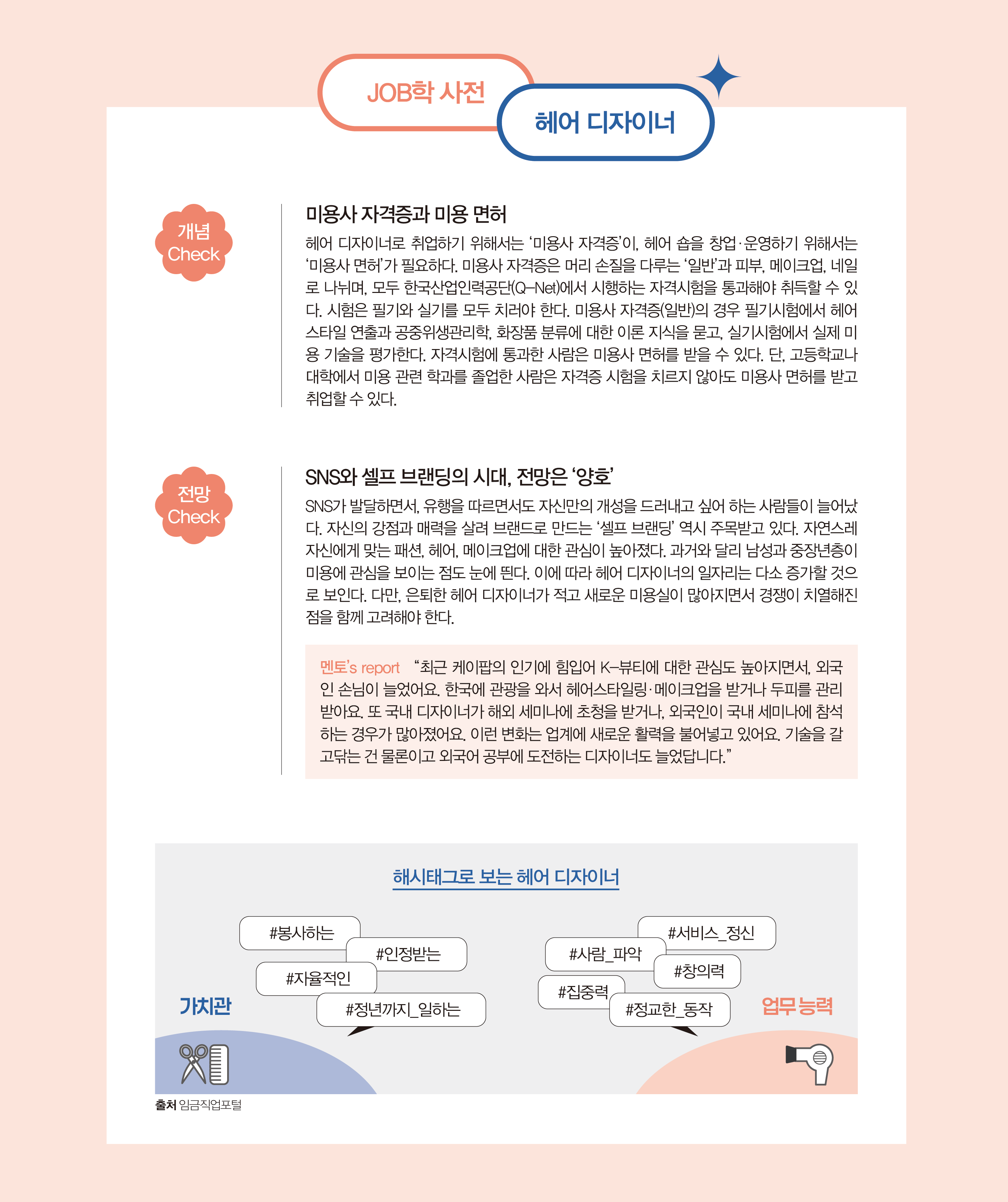 자기 자신뿐만 아니라 다른 사람을 꾸며주는 걸 즐거워하는 사람에게 잘 맞을 거예요. 타인에게 관심이 많고 눈썰미가 좋아서 상대에게 무엇이 잘 어울릴지 금방 생각해내는 능력이 필요하고요. 손재주가 있으면 좋겠지만, 결과물이 뜻대로 만들어지지 않는다고 일찍부터 포기하진 않길 바라요. 저는 오히려 취업 후에 손재주가 부족하다고 느꼈어요. 그래서 전보다 열심히 연습했더니, 어느새 다른 사람들의 눈에 손기술이 좋은 사람으로 비치더라고요.