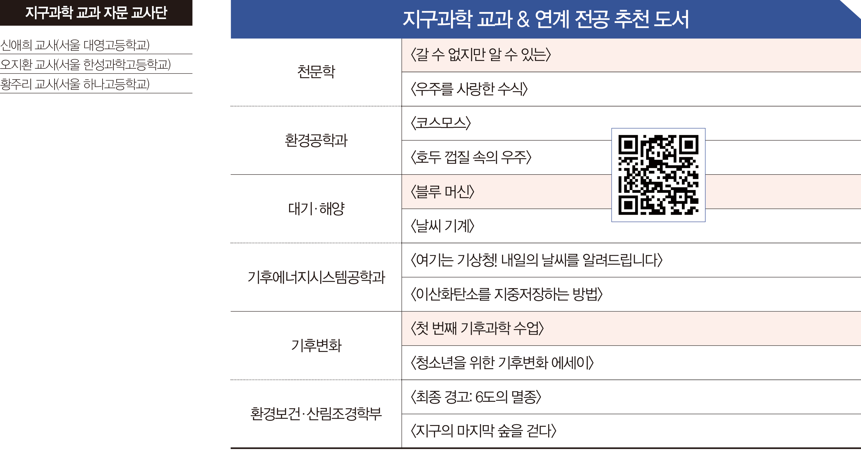 “기후변화와 기후위기는 누구나 한 번쯤 들어봤을 법한 주제로, 최근 교육과정에도 관련 내용이 많아지고 있습니다. 다만 그 과학적 원리와 대응책은 아직 단편적으로 다룹니다. 평소 기후변화가 일어나는 과학적 이유를 배우지 못해 아쉬웠다면 이 책을 읽어보세요. 지구 온도가 오르면 왜 태풍이 강해지는지, 왜 중위도에서는 한파가 발생하는지 <지구과학Ⅰ>의 내용을 바탕으로 알려줍니다. 바이오 숲, 습지 조성 등 기후변화 대응책도 과학적으로 설명해요. 또한 기후 모델링의 방법과 원리, 다양한 연구 내용을 이해하기 쉽게 풀어, 기후변화 연구의 특징과 최신 동향을 파악하기 좋습니다. 향후 기후변화를 연구해보고 싶은 학생에게 강력히 추천합니다.”
