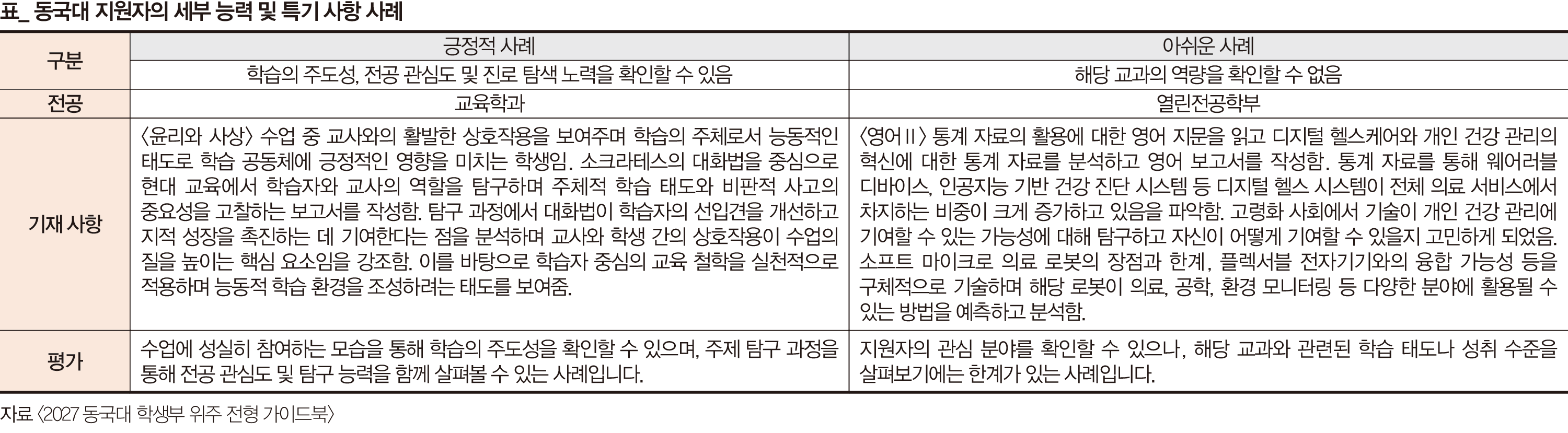 2027 가이드북을 가장 먼저 발표한 대학은 동국대다. 동국대 이재원 책임입학사정관은 “동국대 학생부 위주 전형 가이드북은 긍정적인 사례뿐만 아니라 아쉬운 사례를 함께 공개한다. 학생들이 흔히 가지는 오해를 바로잡기 위해서다. 관심 분야는 드러나지만 해당 교과의 역량을 확인하기 어려운 기록, 고등학교 수준을 벗어난 탐구 활동은 흔히 떠도는 이야기와 달리 긍정적으로 평가받기 어렵다. 가이드북이 고1·2 학생에게 고교 생활의 방향을 안내하는 길잡이가 되길 바란다”라고 부연한다.