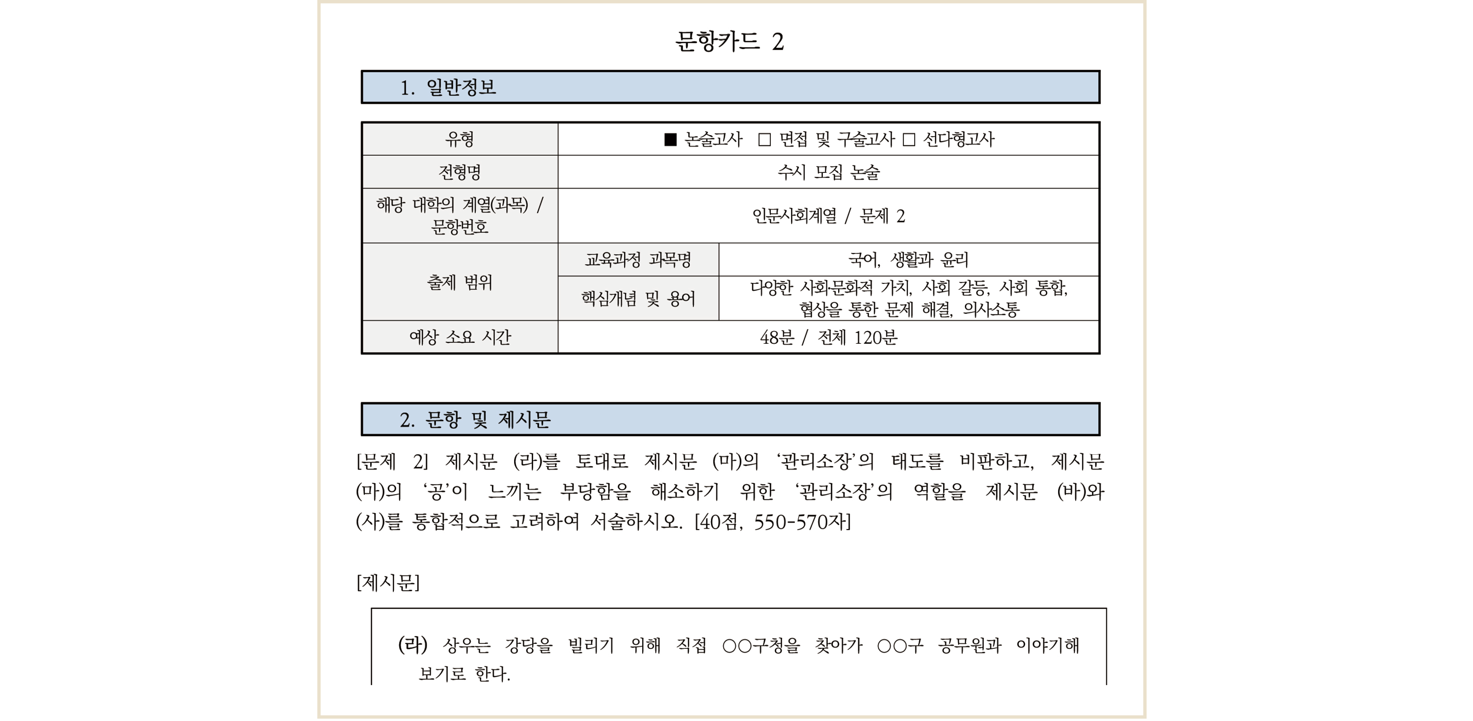가장 먼저 문항의 기본 정보를 확인하자. 문제가 출제된 고사 유형과 모집 단위를 보고 나에게 필요한 문제를 찾으면 된다. 출제 범위와 핵심 개념은 제시문 구성과 빈출 개념을 파악하기에 용이하다. 기출문제를 풀 때는 시간을 재면서 예상 소요 시간 안에 답안 작성을 완료할 수 있는지 확인하는 것이 좋다.