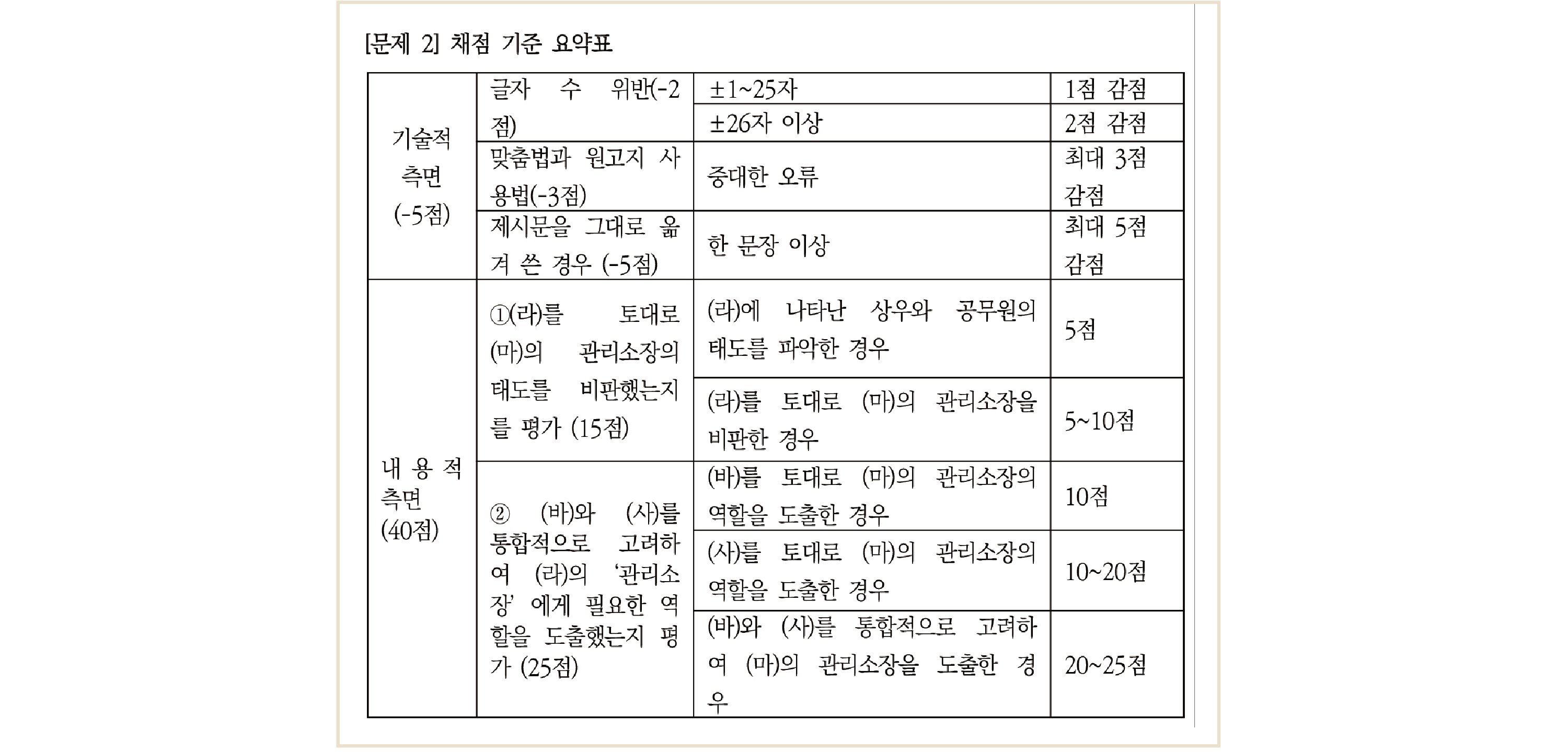 꾸준히 실력을 높이려면 자신의 답안과 예시 답안을 비교해 보완해야 한다. 채점 기준에서 제시한 조건이 예시 답안에 어떻게 녹아 있는지 확인하면 모범적인 답안 구성의 감을 잡을 수 있다. 글자 수 위반이나 맞춤법·원고지 사용법 오류로 감점을 받는 경우도 있으니 채점 기준을 확인해 교정하자.