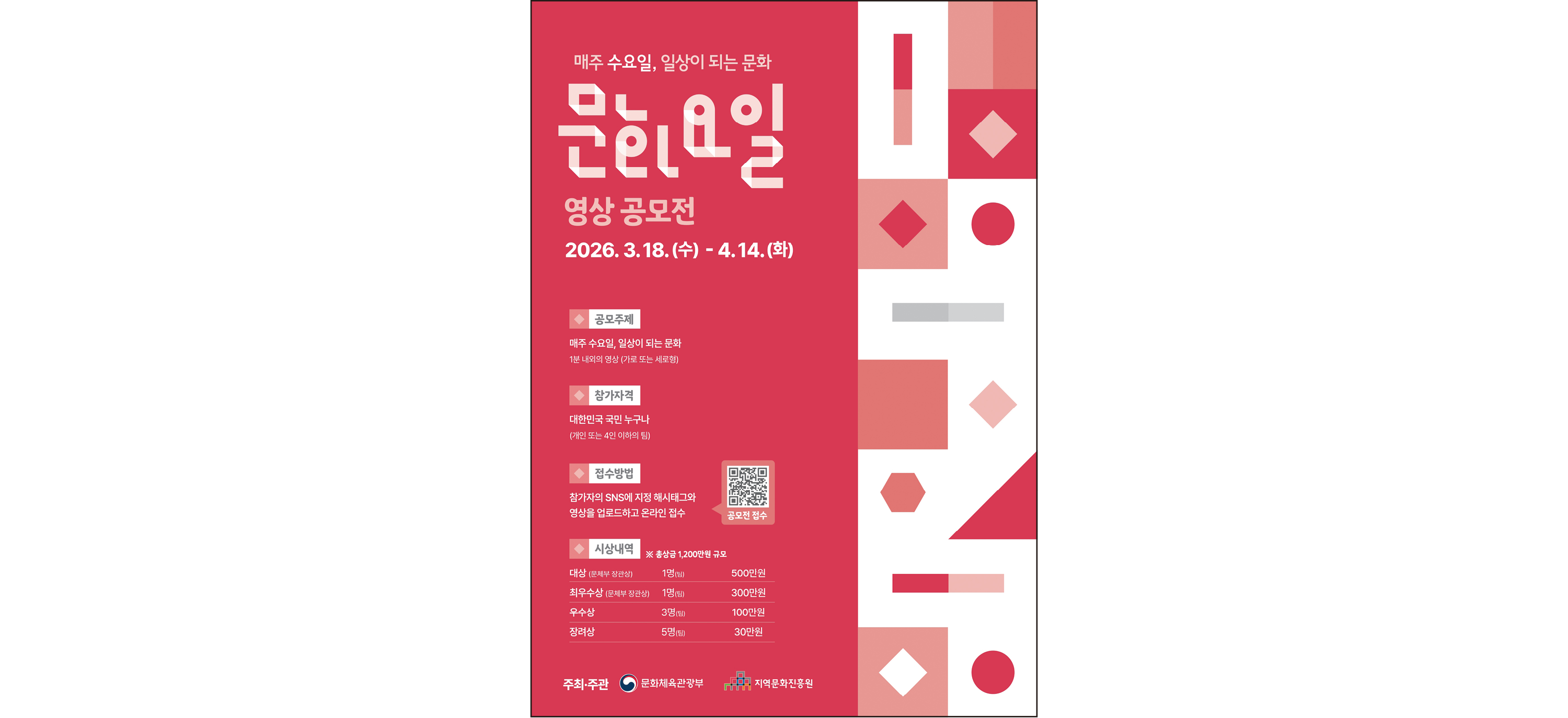 매주 수요일 ‘문화가 있는 날’을 알리기 위한 영상 공모전이 열린다. 공모 주제는 ‘매주 수요일, 일상이 되는 문화’로, 1분 이내의 영상 콘텐츠를 장르 제한 없이 출품할 수 있다. AI 활용도 가능하다. 가로형 또는 세로형 숏폼으로 제작할 수 있으며, 세로형의 규격은 9:16 비율(1천80×1천920픽셀)이다. 대상 수상자에게는 문화체육관광부 장관상과 상금 500만 원을 수여한다.