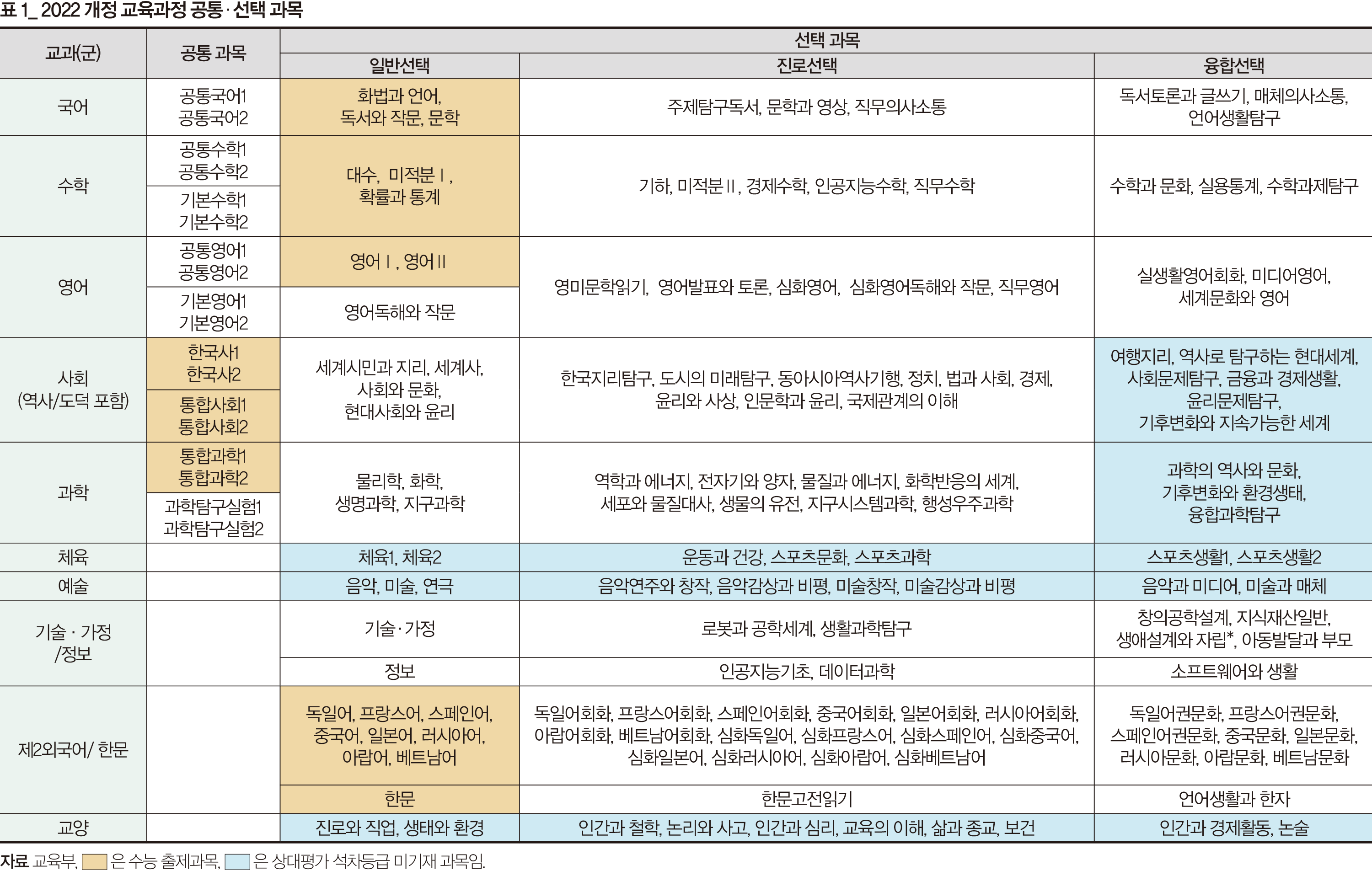 고1이라면 고교학점제에서의 과목 구조와 개별 과목의 특성부터 파악해야 한다. 고등학교 과목은 고1 때 배우는 공통 과목과 고2~3 때 배우는 선택 과목으로 나뉘는데, 선택 과목은 다시 일반선택·진로선택·융합선택으로 세분된다. 공통과 일반선택 과목은 기초, 진로선택 과목은 심화의 성격이 짙다. 융합선택 과목은 여러 교과가 융합된 주제를 다루거나 실생활과 관련 깊은 만큼 어렵지 않은 편이다.
