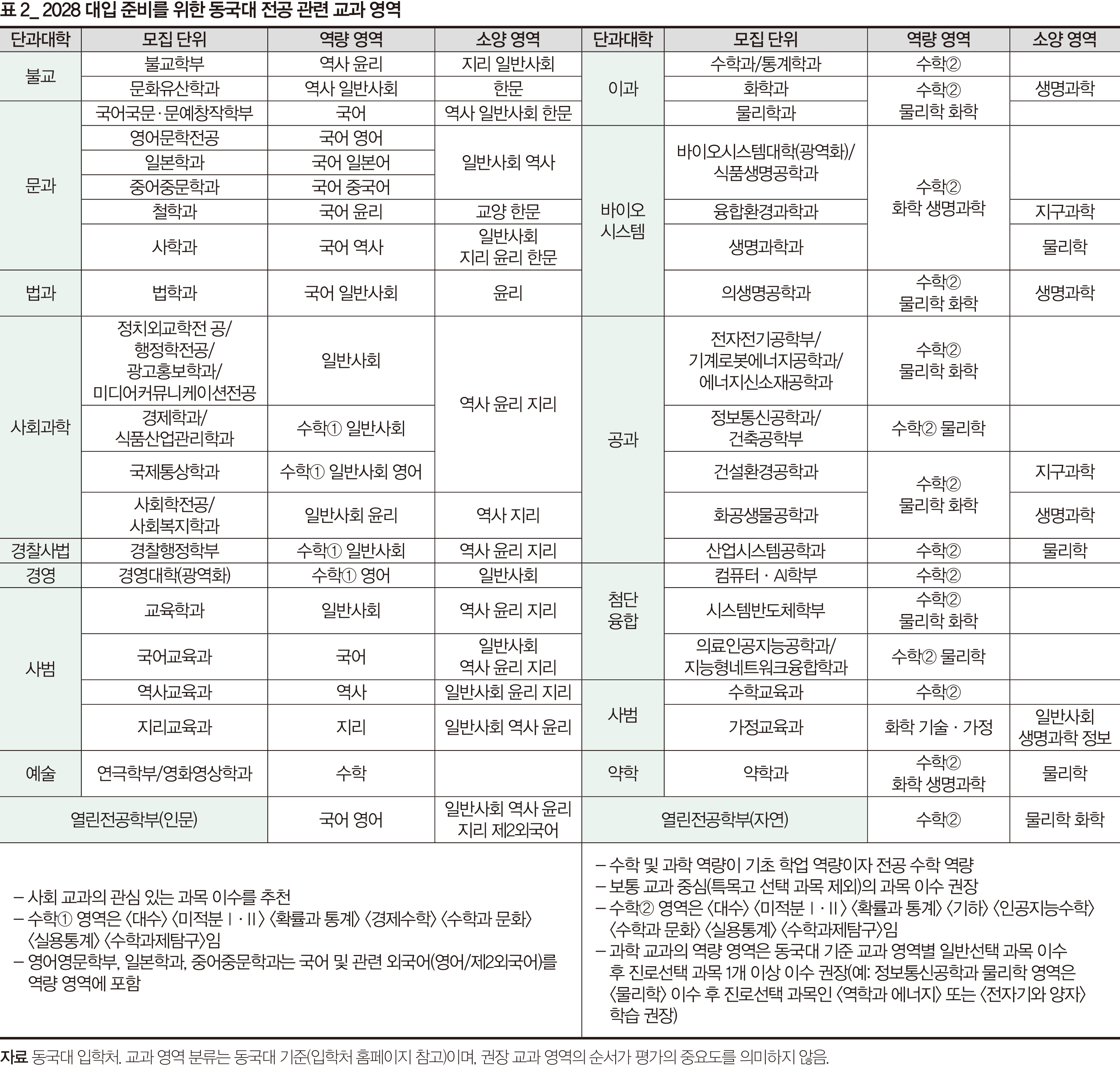 인문 계열은 상대적으로 권장 과목을 제시하는 대학이 적다. 동국대가 개별 모집 단위별로 권장 과목을 안내하고 있어 참고할 만하다. 또 서울대는 인문대학 사회과학대학 간호대학 경영대학 농업생명과학대학(농경제사회학부) 사범대학 생활과학대학(소비자아동학부·식품영양학과·의류학과) 지원자에게 제2외국어/한문 교과에서 1과목 이상 이수하길 권한다.
