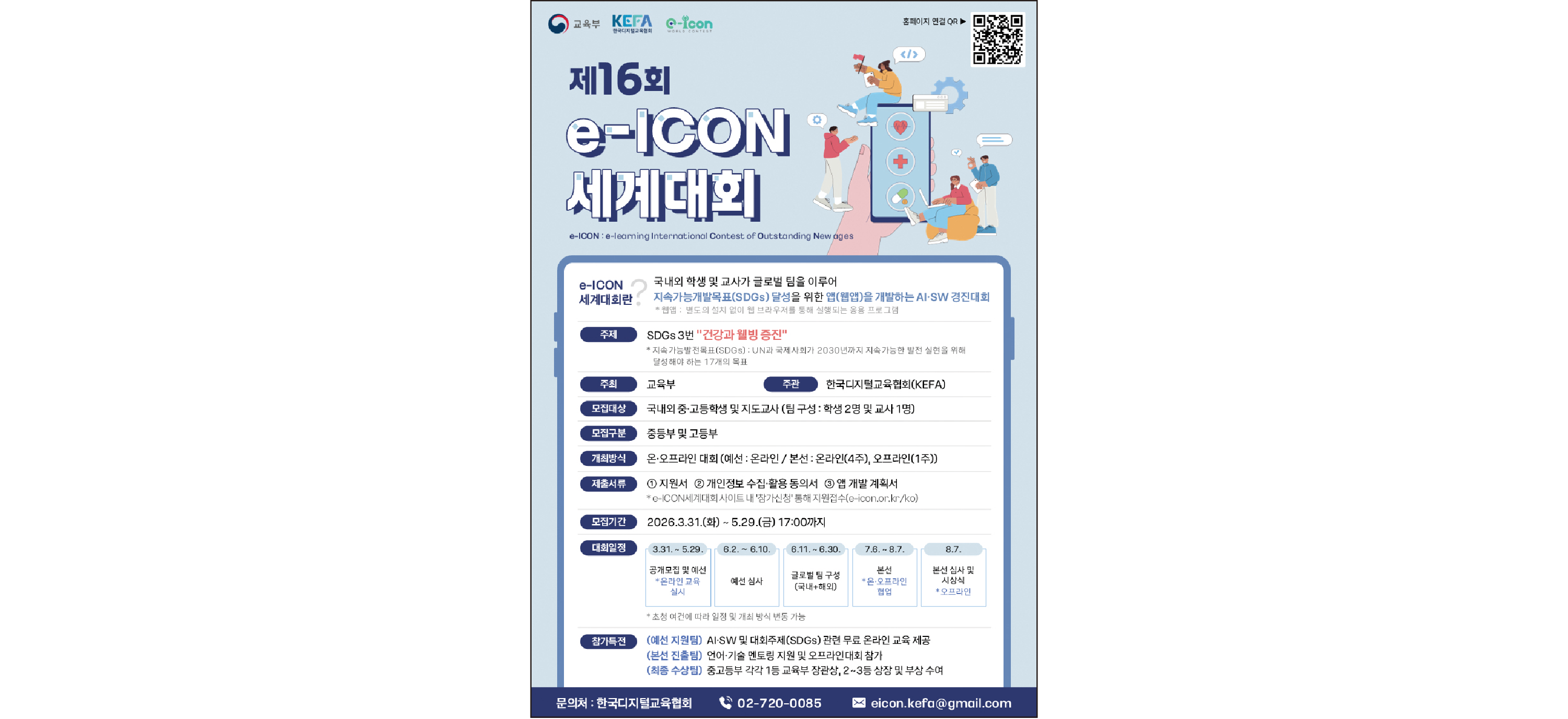 국내외 중·고등학생을 대상으로 한 제16회 e-ICON 세계대회가 열린다. e-ICON 세계대회는 AI·SW와 SDGs에 관심 있는 학생들이 앱을 개발해 글로벌 문제 해결에 도전하는 국제 경진대회다. 공모 주제는 건강과 웰빙이다. 예선 참가자 전원에게 온라인 기초·심화 교육을 제공해 웹·앱 개발 경험이 없는 학생도 단계적으로 개발 역량을 기를 수 있다. 학생 2인, 교사 1인으로 팀을 구성해 대회 홈페이지 ‘참가 신청’ 탭에서 지원하면 된다. 국내외 학생들과 협업하며 SDGs 문제 해결 경험을 쌓을 수 있는 기회다. 1등 수상자에게는 교육부 장관상을 수여한다.