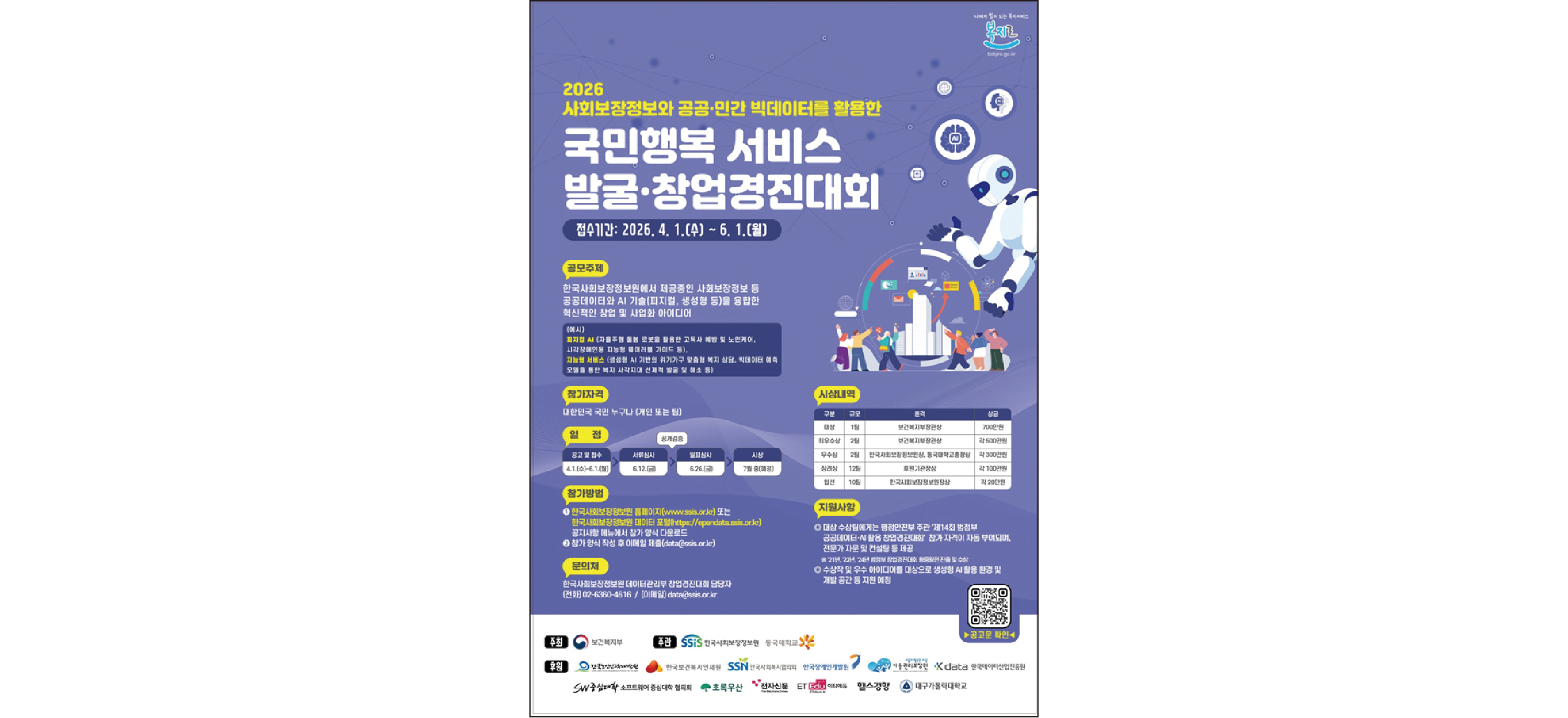사회보장정보 등 공공 데이터와 AI 기술을 융합한 창업 및 사업 아이디어를 주제로 열리는 경진대회다. 참가 신청서와 사업 계획서 등을 작성해 이메일(data@ssis.or.kr)로 접수하면 된다. 우수 아이디어는 향후 실제 서비스로 발전할 수 있도록 후속 지원한다. 대상 수상자에게는 보건복지부 장관상과 상금 700만 원을 수여한다.