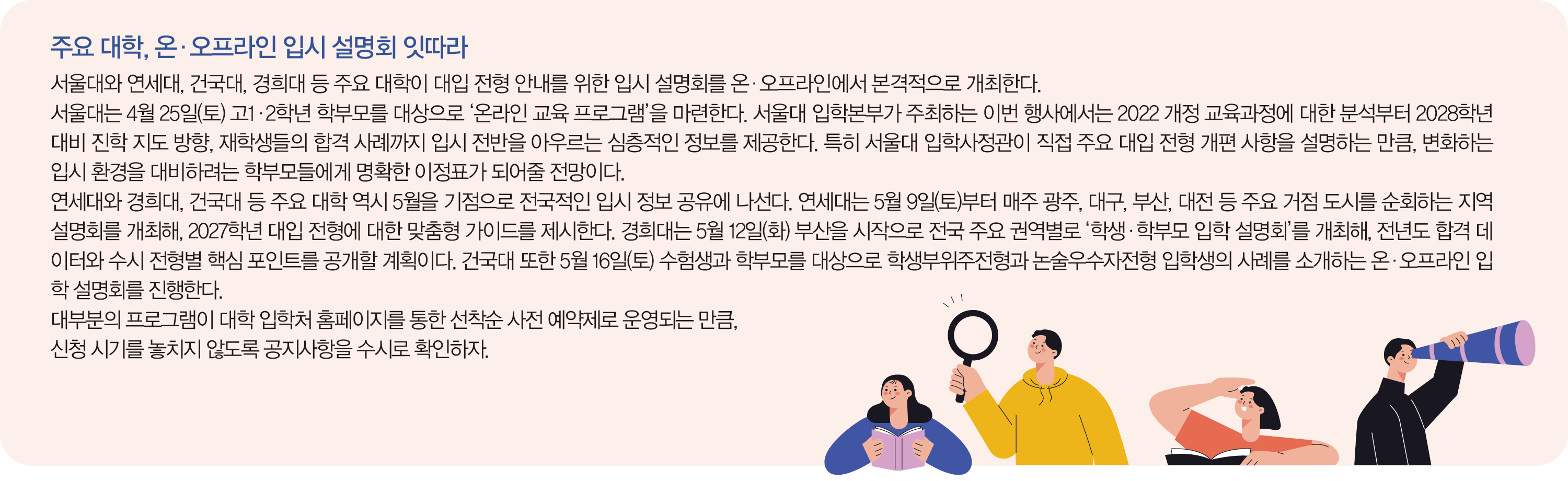 시험 부담이 한풀 꺾인 시기, 1학기 학부모 상담 주간이 운영된다. 자녀의 교우 관계와 수업 태도, 학업 성취도가 궁금하다면 학교를 찾아 담임 교사와 직접 이야기를 나눠보는 것이 좋다.