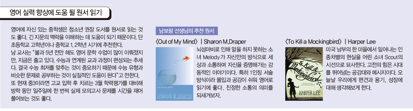 이렇듯 영어 학습량을 극복하기 위해 중학교 때 시도할 수 있는 효율적인 공부 방법은 어휘량을 늘리는 것이다. 내신 시험도, 수능 영어도 결국 영어를 읽어내야 하기 때문에 방학과 틈새 시간을 통해 중학교 영단어는 물론 수능 영단어까지 어휘량을 늘리는 것이 좋다. 남 교사는 “고등학교 1학년 학생들을 보면 중학교 때 공부한 정도가 각양각색이다. 속도전으로 공부하기보다 단어 하나를 외우더라도 확장성을 가지고 제대로 의미를 파악하길 바란다”라고 말한다.