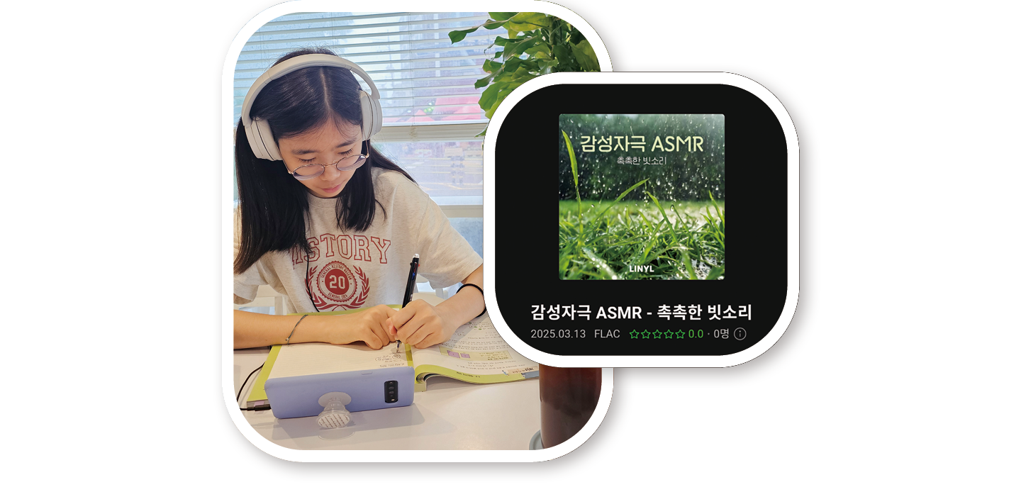 외향적인 아이들은 책상 앞에 진득하게 엉덩이를 붙이고 공부하기가 더 어려운 것 같아요. 이어폰을 꽂고 공부하는 걸 보고 있자니 제대로 집중하는지 의문이 드네요. 교육 전문가의 조언은 중독성 있는 가사로 된 음악은 제외하고, 공부하기 싫을 때는 시간을 정해서 들으라는 것! 빗소리, 필기 소리 같은 ASMR은 뇌를 기분 좋게 자극해서 심리적 안정을 준다고 합니다.