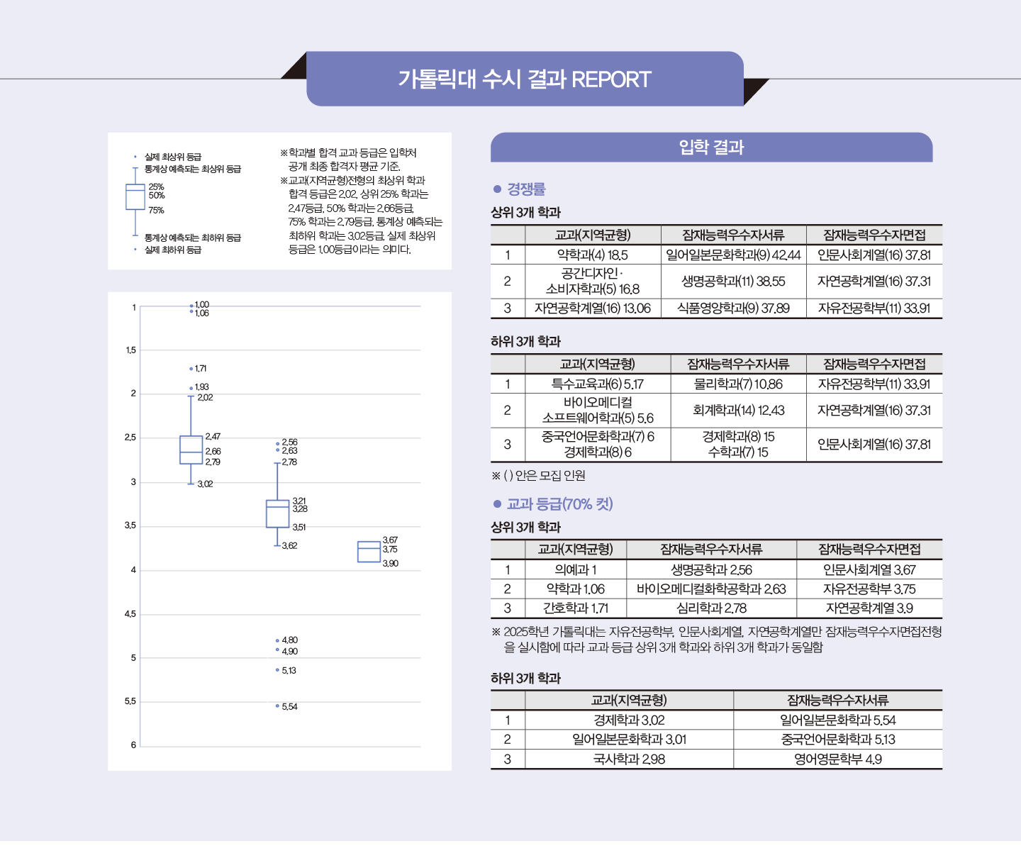 가톨릭대는 자료집을 통해 성적 합격선과 실질 경쟁률 등을 모두 공개하고 있다. 유튜브 채널을 통해서 합격자 사례와 학생부 또한 공개하니 대학이 제공하는 자료를 잘 활용하길 바란다. 변화가 많았던 전년도 입시 결과만 참고하지 말고 3년 치 입시 결과를 본 다음 지원을 결정하면 좋겠다.