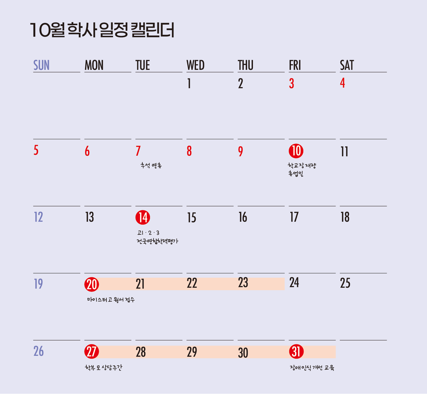 한편 전국 고1·2 학생을 대상으로 실시되는 10월 학평도 같은 날 경기도교육청 주관으로 진행된다. 한 해 동안의 학습 성취를 점검하고 부족한 부분을 확인할 수 있는 소중한 기회인 만큼, 최선을 다해 응하자.