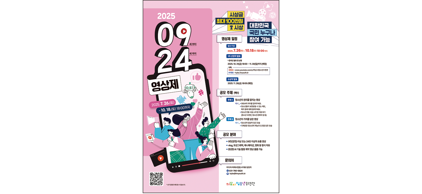 하남시청소년수련관이 개최하는 청소년 영상 공모전이다. 주제는 0924의 의미, 청소년에게 보장되는 제도와 복지, 청소년 전용 시설 소개 및 이용 후기 등이다. 0924는 청소년 기본법상 청소년의 정의는 9세 이상 24세 이하인 사람이라는 데서 따온 숫자다. 청소년의 일상, 청소년의 다채로운 재능과 도전을 담아도 좋다. 형식은 브이로그 모션그래픽 애니메이션 영화 등 자유다. 9컷·24초 이상, 해상도 1천920×1천80픽셀 또는 1천80×1천920픽셀 이상의 숏폼을 제작해 구글 폼으로 접수하면 된다. 최우수상 수상자에게는 상금 100만 원을 수여한다.