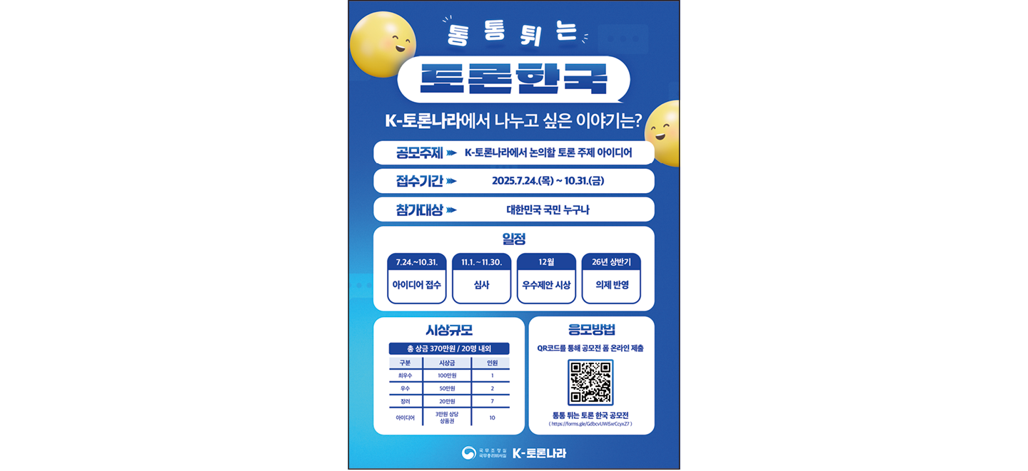 국무조정실 국무총리비서실이 주최하는 토론 주제 아이디어 공모전이다. 국민 참여형 국정 플랫폼인 K-토론나라에서 논의할 수 있는 다양한 국정 토론 주제를 공모한다. 국민 소통의 장을 만들어 토론을 통해 정책 합의와 실질적 변화를 가져오는 것이 목표다. 아이디어는 구글 폼으로 접수하면 된다. 최우수상 수상자에게는 상금 100만 원을 수여한다.