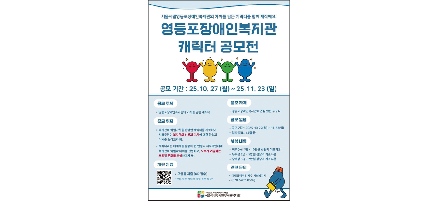 서울시립영등포장애인복지관에서 캐릭터 제작 공모전을 연다. 복지관의 비전과 가치에 대한 지역 주민의 관심과 이해를 높이는 것이 목표다. 전 연령의 지역 주민에게 복지관의 역할과 의미를 전달할 수 있는 캐릭터를 만들어 설명과 함께 구글 폼으로 접수하면 된다. 최우수상 수상자에게는 10만 원 상당의 기프티콘을 수여한다.