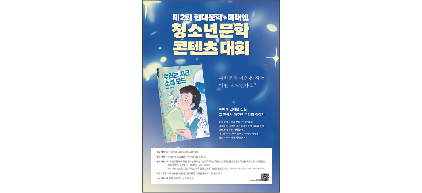 출판사 ‘현대문학’과 교육 출판 ‘미래엔’에서 청소년 문학 콘텐츠 대회를 개최한다. 제2회 현대문학X미래엔 청소년 문학상 수상작인 하유지 작가의 <우리는 지금 소설 모드>를 주제로 창의적인 독후감 혹은 SNS 콘텐츠를 제작하면 된다. 독후감은 글자 크기 12포인트로 A4용지 2~3매 분량을, SNS 콘텐츠는 본인의 계정(인스타그램, 유튜브, 틱톡)에 게시한 3분 이내의 영상·10장 이내 슬라이드 이미지의 링크를 네이버폼으로 제출하면 된다. 도서에 대한 이해도와 표현의 창의성을 기준으로 평가한다. 개인, 단체 부문의 대상 수상자에게는 각각 상금 50만 원을 수여한다.