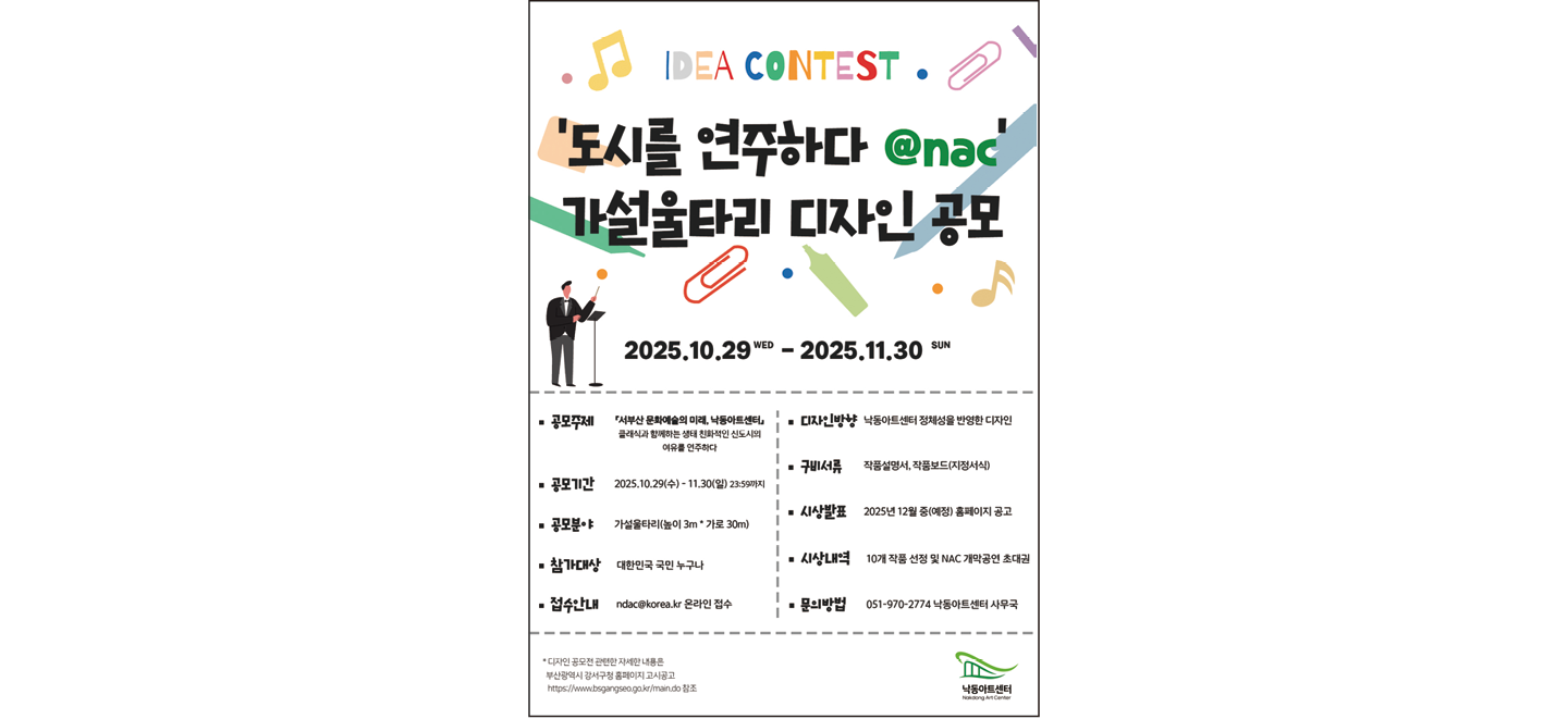 낙동아트센터에서 공사장 가설울타리에 적용할 디자인을 공모한다. ‘클래식과 함께하는 생태 친화적인 신도시의 여유를 연주하다’라는 주제에 맞춰, 공사장 가로 30m에 해당하는 디자인을 대형 그래픽, 액자형 디자인 등 다양한 형식으로 자유롭게 제안하면 된다. 작품은 이메일(ndac@korea.kr)로 접수받는다.