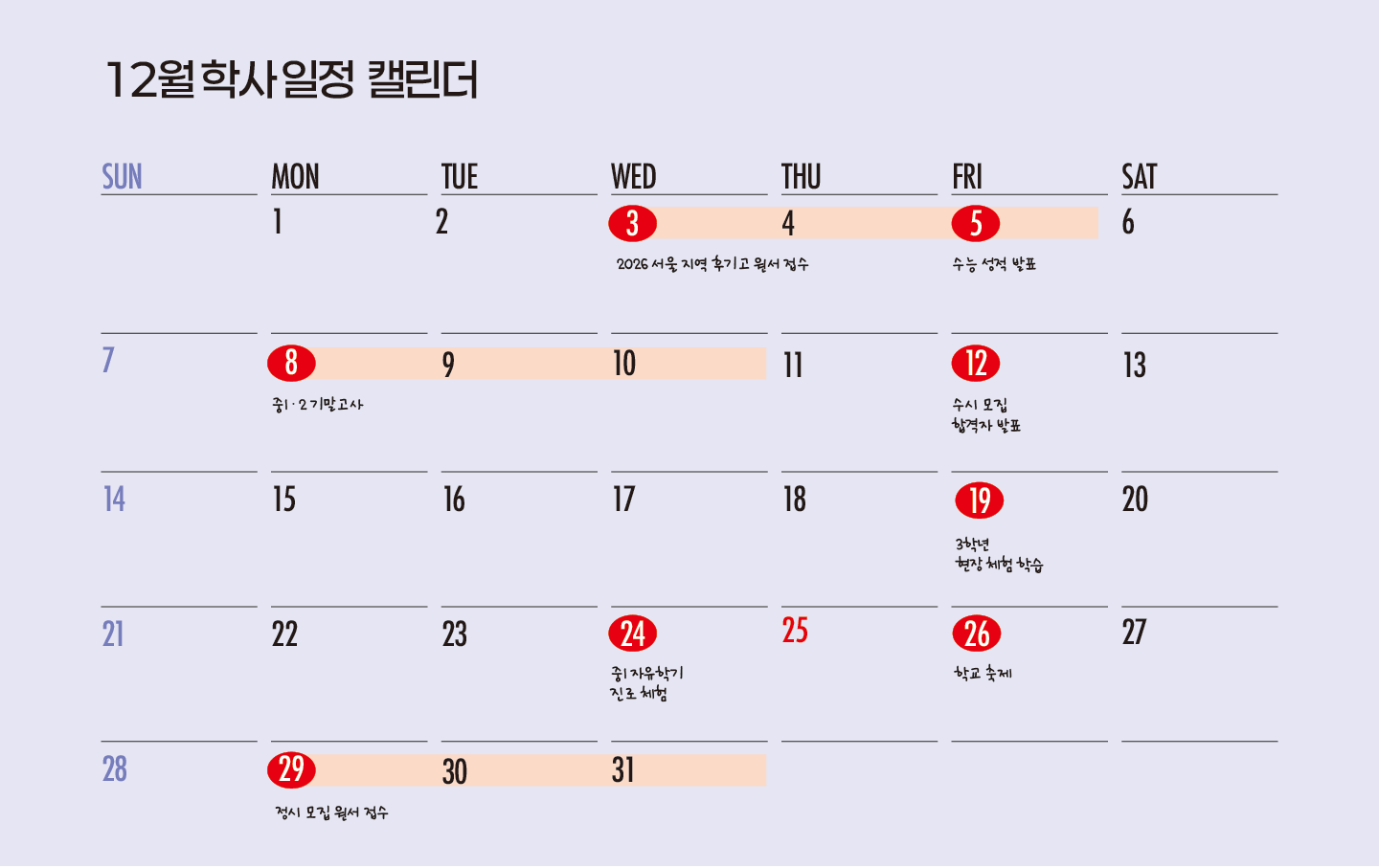 2026학년 대학 정시 모집 원서 접수는 12월 29일(월)부터 31일(수)까지 사흘간 진행된다. 수능 성적 발표 직후 시작되는 정시 모집은 지원 대학과 모집 단위를 신중히 선택하는 것이 무엇보다 중요하다. 올해는 모든 대학의 마감일이 통일돼, 대학별 마감일을 따로 확인하는 부담은 줄었다. 하지만 마지막 순간까지 경쟁률을 확인하며 접수하는 눈치싸움은 예전보다 치열할 것으로 예상된다. 수능 백분위, 대학별 환산 점수, 전형 요소(수능 반영 비율·가산점 등)를 꼼꼼히 비교·분석해 전략적으로 지원 계획을 세우자. 접수 과정에서 실수가 없도록 여유를 두고 준비하고, 최종 제출 전 내용을 꼼꼼히 확인하는 것이 중요하다.