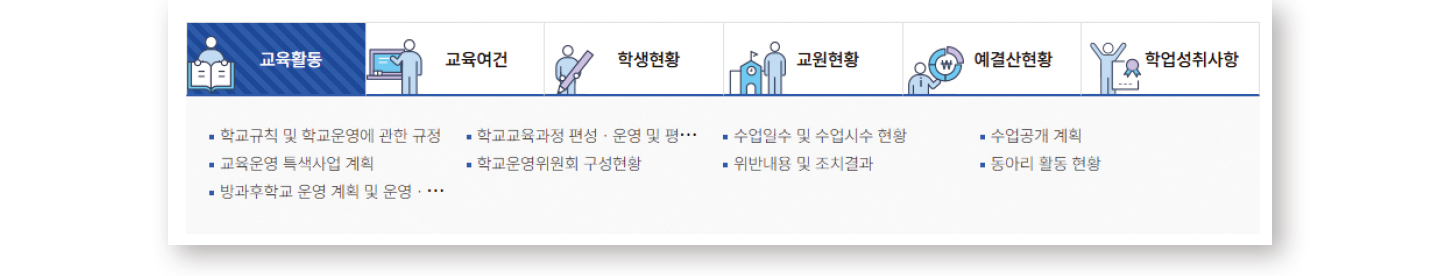 ‘학교 알리미’ 검색창에 원하는 고교명을 입력한다. 이후 공시 정보 메뉴에서 ‘교육 활동’에 접속해 ‘교육운영 특색사업 계획’을 클릭한다.