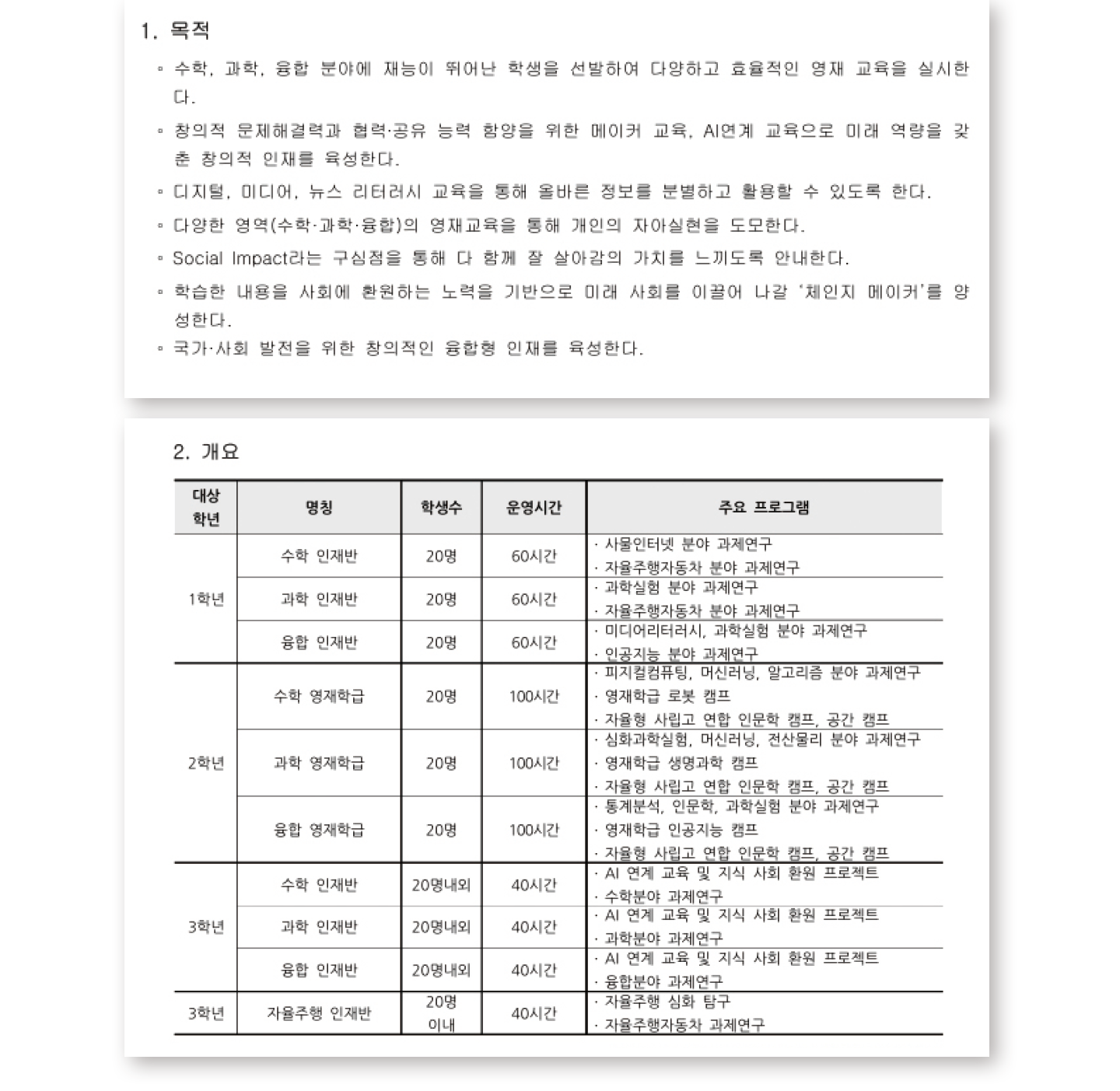 각 학교가 주요하게 내세우는 과목이나 사업이 무엇인지 한눈에 파악 가능하다. 해당 학교는 수학 과학 융합 분야에 재능이 뛰어난 학생을 선발해 다양하고 효율적인 영재 교육을 실시한다. 공학 계열에 관심이 있고 수리 역량을 기르고 싶은 학생이라면 이런 특징을 눈여겨봤다가 지원하면 좋다.
