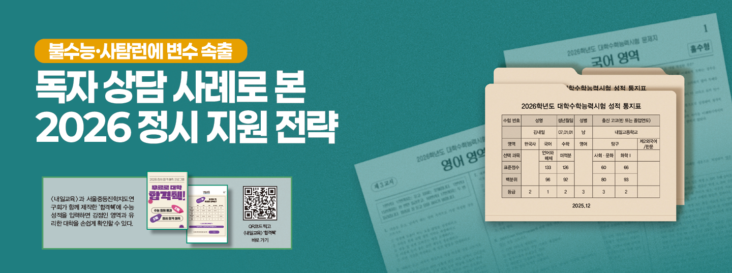 상황이 이렇다 보니 수험생들은 자신의 성적이 가장 유리하게 반영될 대학을 찾는 것이 어느 때보다 중요해졌습니다. <내일교육>이 독자들의 신청을 받아 공교육 진학 전문 교사와 상담을 진행했습니다. 가채점 대비 성적이 크게 하락해 고민인 공학 계열 지망 학생, 수학 4등급에 갈피를 잃었지만 재수는 하고 싶지 않은 인문 성향 학생, ‘사탐+과탐’ 조합으로 응시했지만 탐구에서 4~5등급을 받아 인문 계열 지원도 검토하고 있는 자연 성향 학생 등 세 사례 모두 특정 영역에서 예상 밖의 성적을 받아 지원 전략 수립에 고심하고 있었습니다. 이들의 상담 과정을 지면에 옮겼습니다. 고3 독자는 정시 지원 전략을 세우는 데, 예비 고2~3 자녀를 둔 독자라면 까다로운 정시 구조를 미리 이해하는 데 도움이 될 것입니다. 수능 채점 결과를 반영해 업데이트된 <내일교육>의 정시 예측 서비스 ‘합격췍’과 함께 보면 더 유용할 거예요.