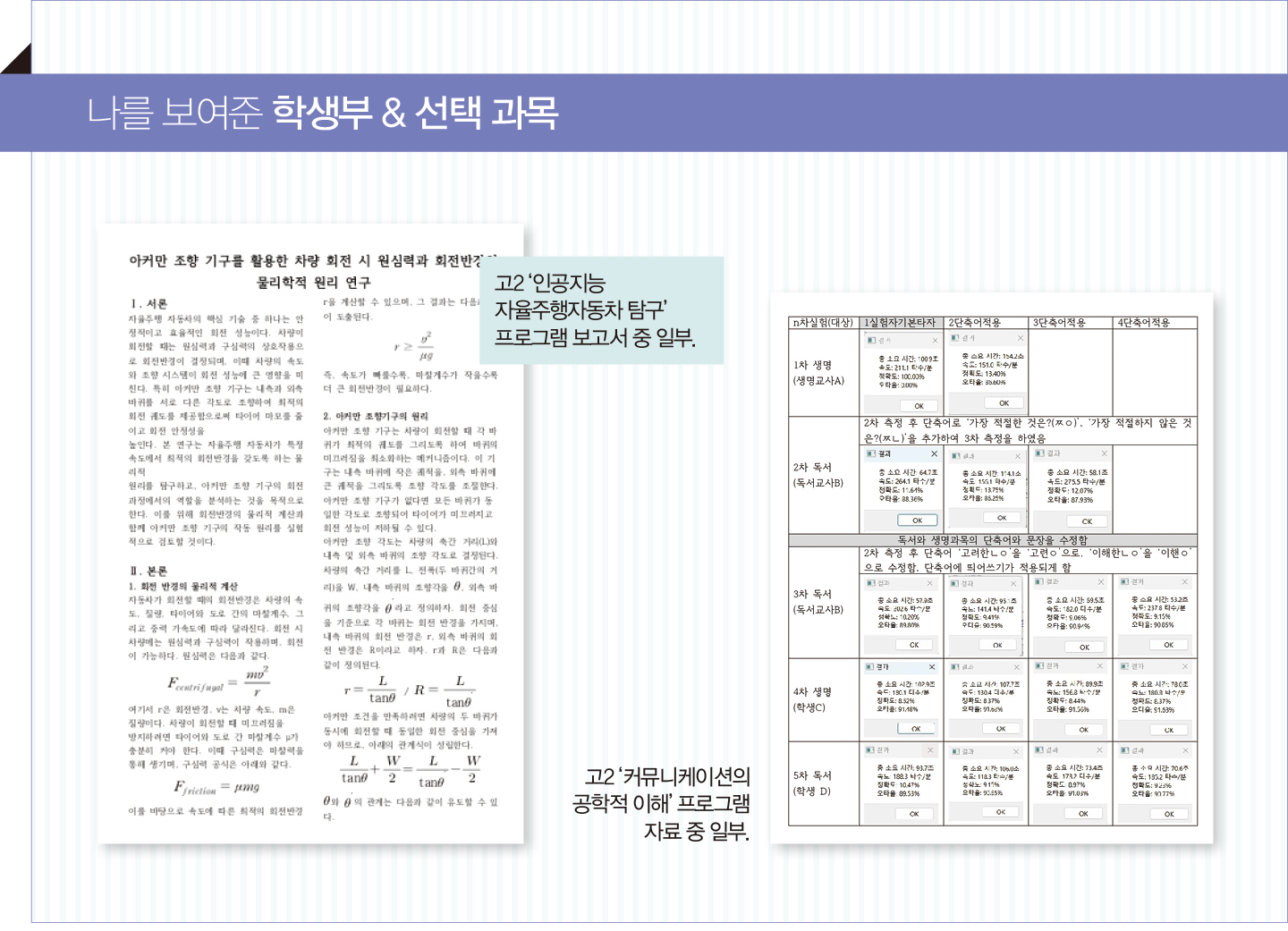 희망 진로가 명확했던 만큼, 탐구 활동도 처음엔 지망 분야에 집중했다. 한데 2학년이 되며 활동 주제에 변화가 생겼다. <확률과 통계>에서 조건부 확률 기반의 베이지안 통계로 의료 데이터를 탐구한 것처럼, 교과 내용에 데이터를 더한 탐구가 늘어난 것. 학교 특색 프로그램으로 진행했던 ‘인공지능 자율주행 자동차 탐구’, 진로선택 과목 <커뮤니케이션의 공학적 이해>가 전환점이 됐다. ‘인공지능 자율주행 자동차 탐구’의 경우 처음엔 관심 밖이었지만, 자율주행에 적용되는 기술이 생명공학에도 도움이 될 수 있다는 설명을 듣고 도전하게 됐다.