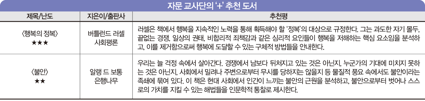 “명예, 부, 권력 등 모든 욕구가 충족되면 우리는 진정으로 행복해질까요? 아리스토텔레스는 행복을 단순한 쾌락이 아닌 ‘덕에 따른 영혼의 활동’, 즉 인간이 자신의 능력을 가장 탁월하게 발휘하며 살아가는 과정이라고 말합니다. 책은 ‘어떻게 살아야 잘 사는 것인가’라는 근본적인 질문에 답하며, 인간의 삶의 유형을 분류하고 무엇이 궁극적 행복이 될 수 있는지 설명합니다. 또한 진실·우정·분노·수치 같은 일상적 감정과 덕목이 행복과 어떻게 연결되는지도 알려줍니다. 긴 세월, 인류에게 삶의 방향을 제시해준 지침서를 읽으며 지금 우리가 추구해야 할 진정한 행복인지 묻고 답하는 시간을 가져보길 바랍니다.”_ 자문 교사단